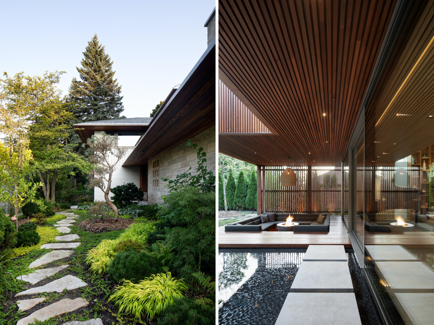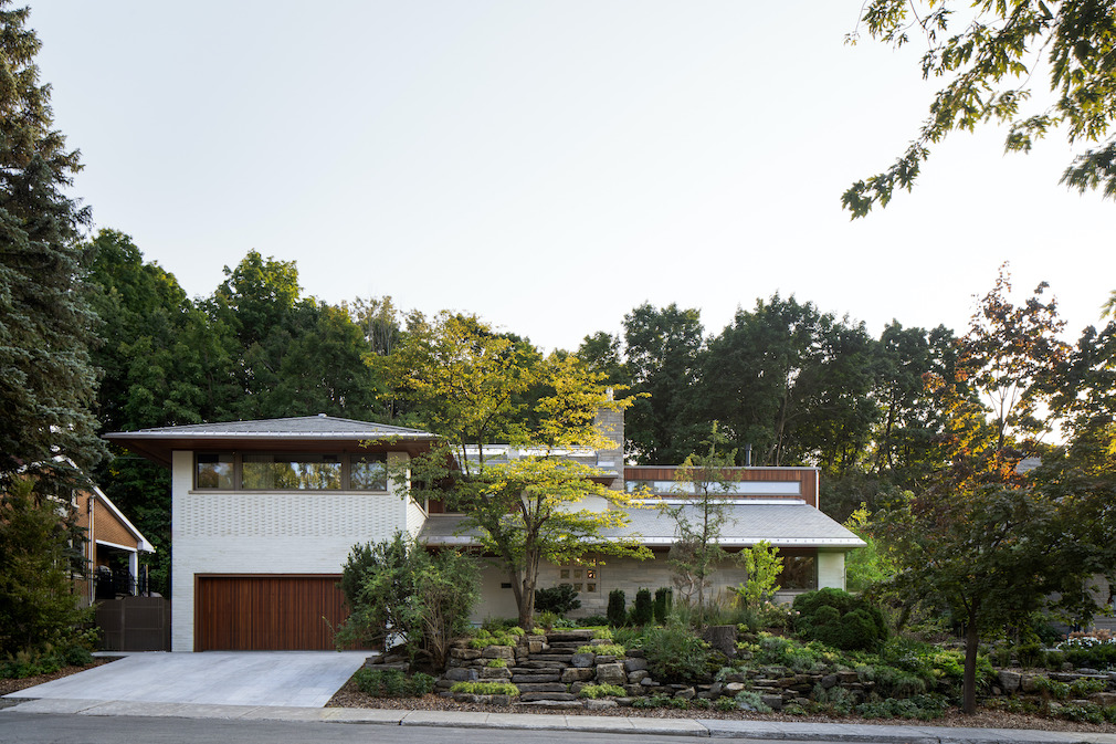 The original design, crafted by Architects Morin & Cinq-Mars, drew inspiration from the architectural work of Frank Lloyd Wright. This complete renovation and extension aimed to honor the historical essence, while establishing a serene retreat on Mount Royal. The interventions pay homage to this iconic architect and integrate Japanese and Scandinavian influences, which are highly appreciated by the owners. The result is a spacious, welcoming living space that is deeply connected to the natural beauty of the surrounding forest.