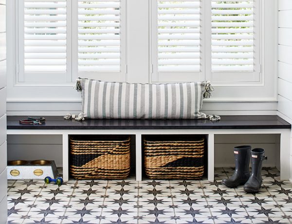 This GTM Architects-designed mudroom offers several fun and functional elements including wall paneling, cement tile…