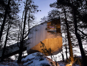 A tiny cabin hovers above the pine-clad slopes of a rocky outcrop, tucked out of…