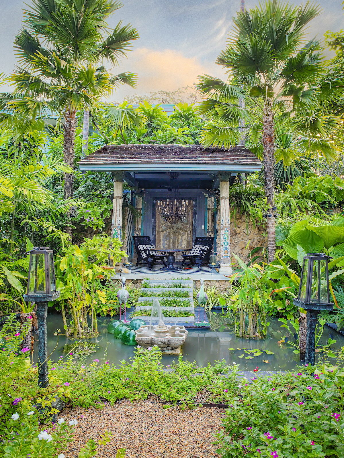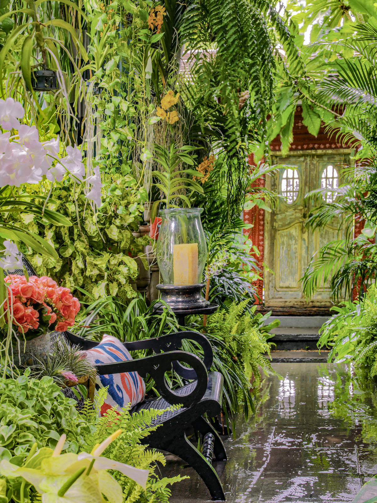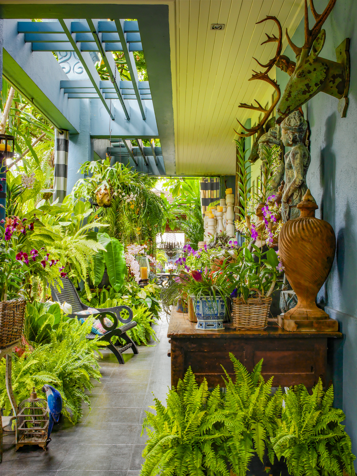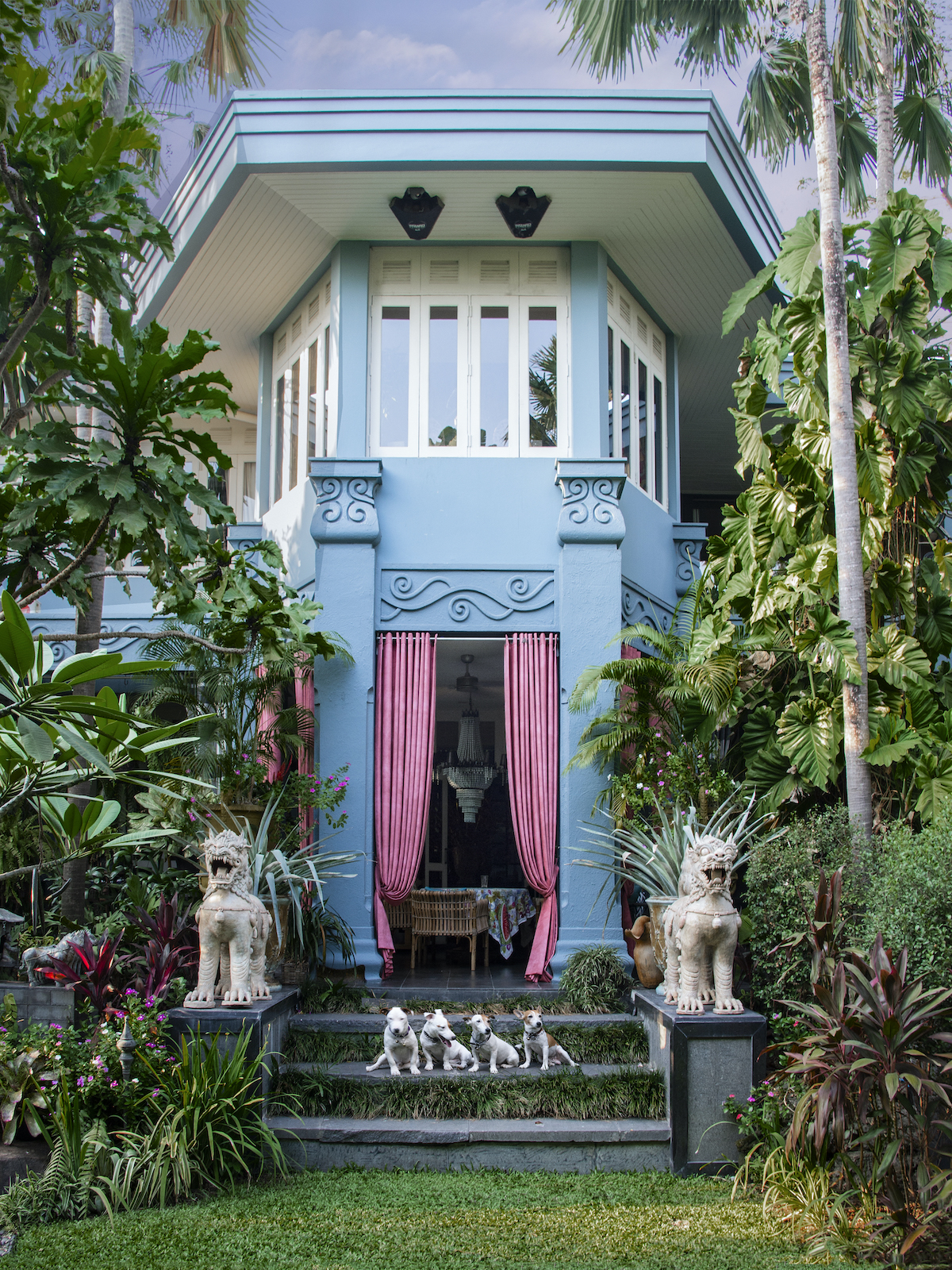 The revitalized dwelling is an ideal backdrop for pieces the couple have acquired during their far-flung travels. Think: Pakistani chests, Indian deities and Indonesian doors, along with sculptures, textiles and ceramics from every corner of Asia. In addition, there are dozens of remnants from Bensley’s many design projects. “We’re incurable collectors,” Bensley admits. “Baan Botanica is designed to be an unashamed cocktail of color, texture and different styles that sends the senses reeling.”