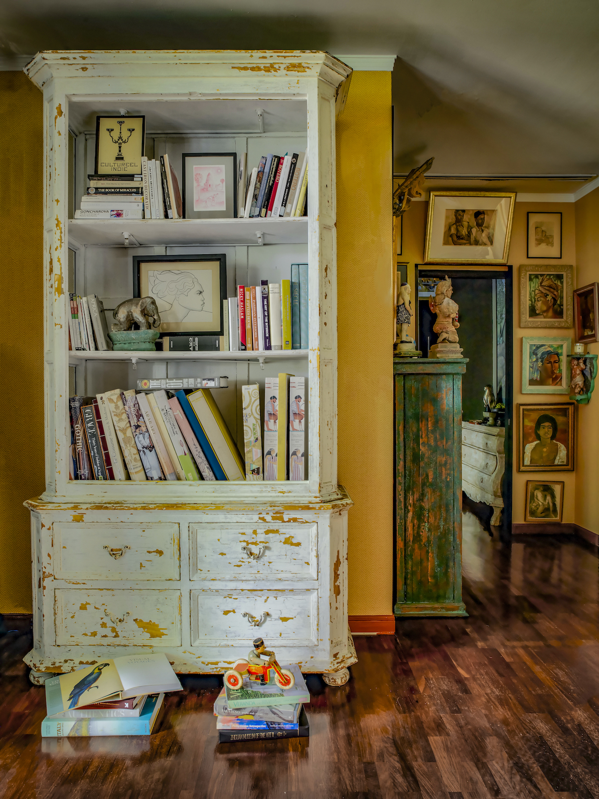 Tucked into a quiet leafy enclave down one of the tendril-like side streets of busy Sukhumvit Road, the two-parcel property had seen better days when acclaimed designer Bill Bensley bought it in the late ’90s. Embarking on a seemingly never-ending renovation that continues to this day, Bensley has coated the original two-story dwelling with a mixture of rice husk and plaster, replaced the vast majority of the existing vegetation and painted the interior walls in vibrant hues.
