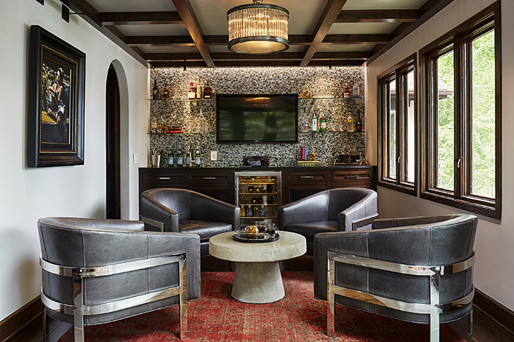 “The design concept is masculine, clean-lined, not overtly modern, but with an infusion of rustic elements, textures, and warmth complimentary to the existing character of the home and natural surroundings of the lake” explained Theresa Dorlini. Rich white walls were used to accent the beautiful artwork throughout.