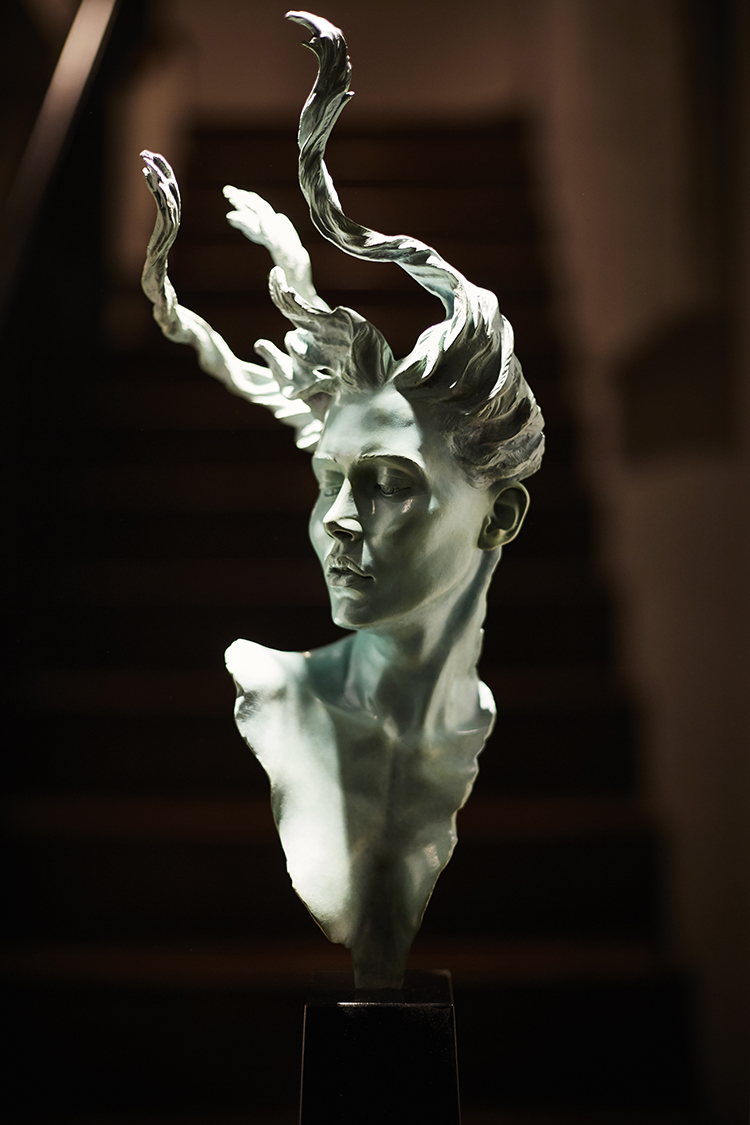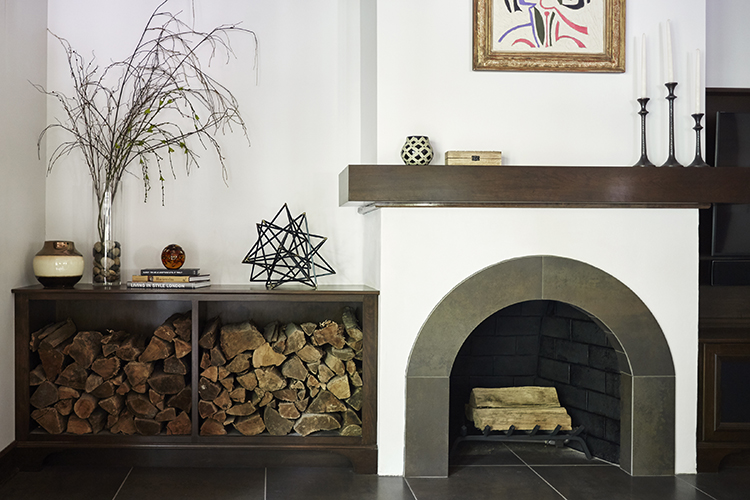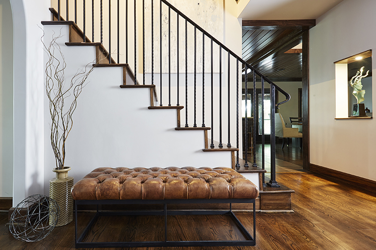 In the entry of the home, they replaced the original knee wall banister with this custom iron railing with an alternating pattern of straight and hammered pickets. They also removed the original wood- burning fireplace to create a niche, custom-sized and lighted to display one of the homeowner’s cherished sculptures.