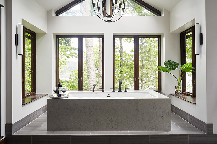 In the master suite, the focus centered on the bathroom area, installing a plinth beneath a new soaking tub, clad on all sides in Caesarstone, to allow a direct line of sight to the lake.