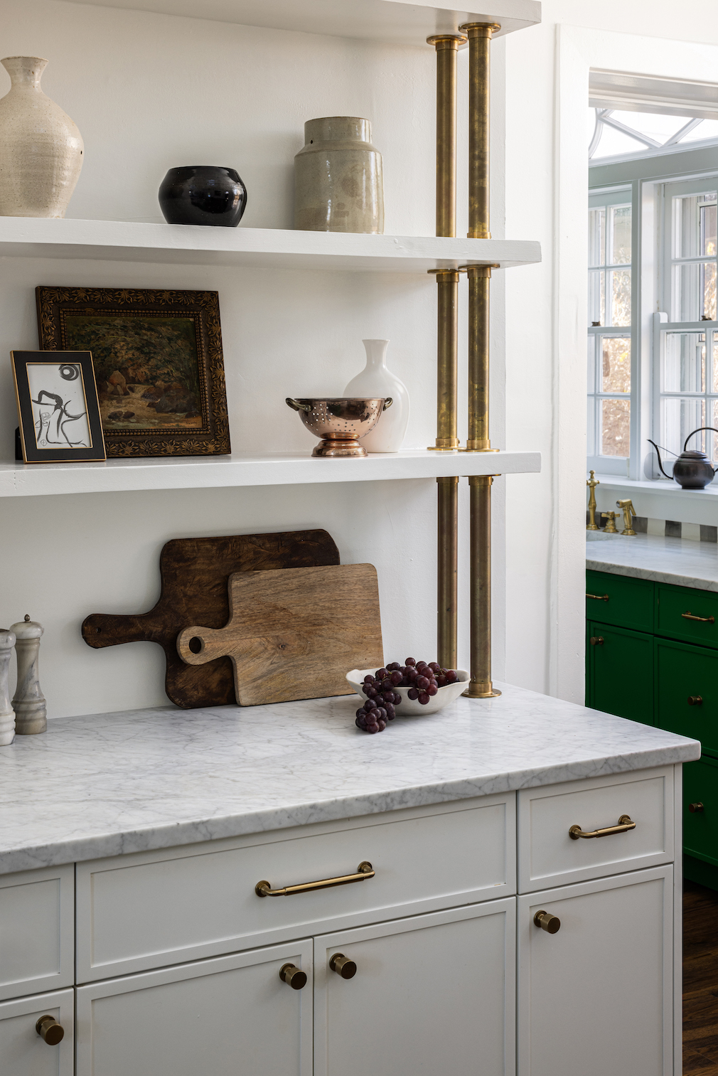 The client was hesitant about a white kitchen, but because of its scale, I used Sherwin-Williams’ Arctic White on that cabinetry and honed Carrara marble from Gramaco Stone Source on the countertops. I then carried the Kelly green onto the base of the island to nod to the butler’s pantry.