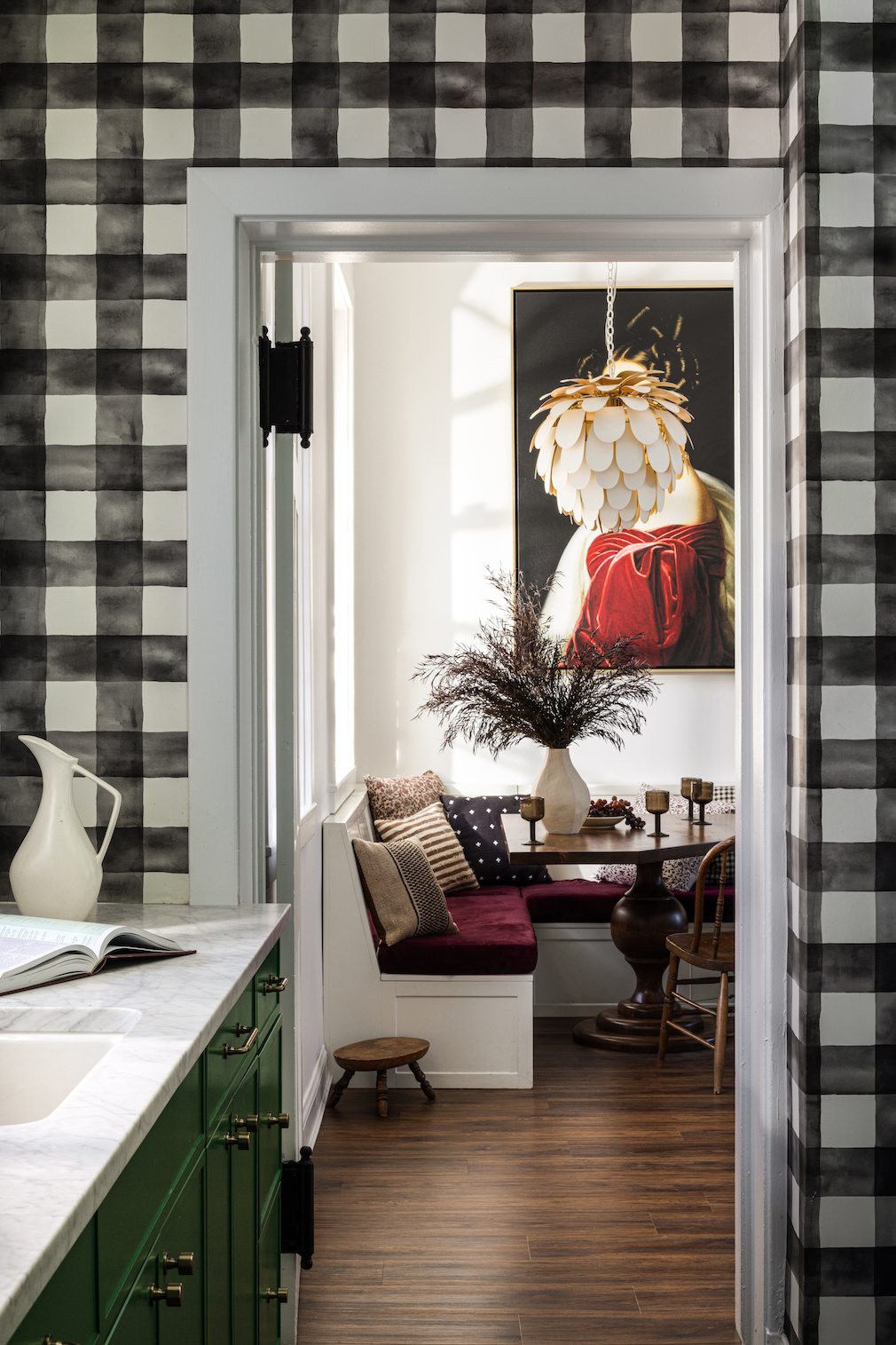 From the Designer | I’ve always been attracted to green, and because it’s found in other rooms on the first floor, it provided a thread to the rest of the home. Benjamin Moore’s Kelly Green was the first paint I suggested, but we tested a lot of others before circling back. The color is very cool, but also very intense, so I focused on mostly using it in the butler’s pantry. The idea behind the black-and-white checked Magnolia Home wallpaper in that same space was to create a “wow” moment. It’s unexpected, but at the same time nods to the country house style we were looking for.