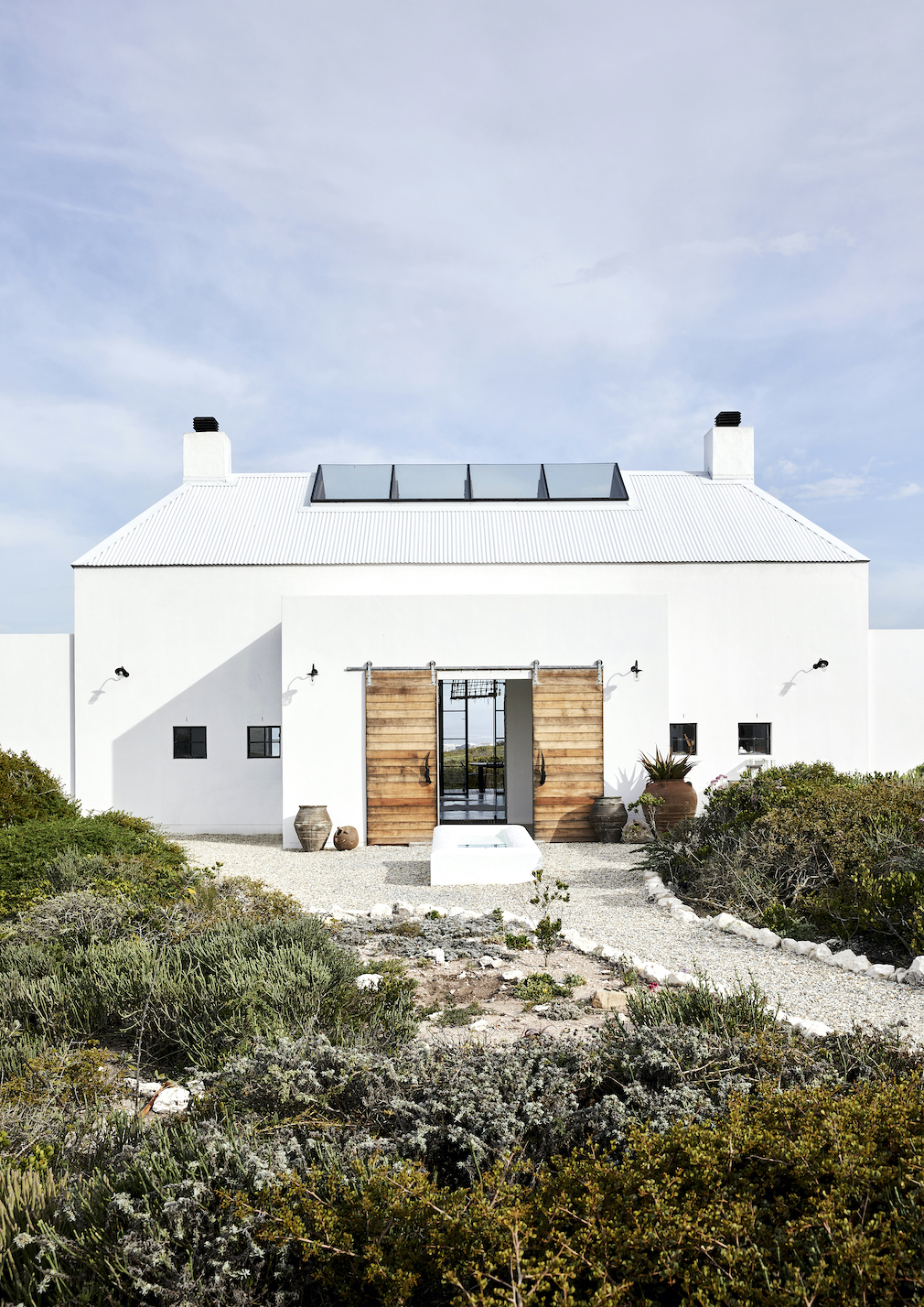 The choice of this seaside location only just won out over a more rural one, as the Elsners are lovers of nature and animals, and they originally toyed with the idea of adding a large greenhouse on this plot, which they purchased during the COVID pandemic. The site is situated on slightly higher ground than the other nearby beachside homes – 150 feet above sea level – and as a result, is surrounded by the region’s protected natural shrubland and enjoys beautiful vistas of the ocean and landscape. On clear days, it’s possible to see the outline of Cape Town’s famed Table Mountain on the far horizon, around 55 miles away. Of course, the fact that the closest beach is just a few minutes’ walk from the property adds to its charms.
