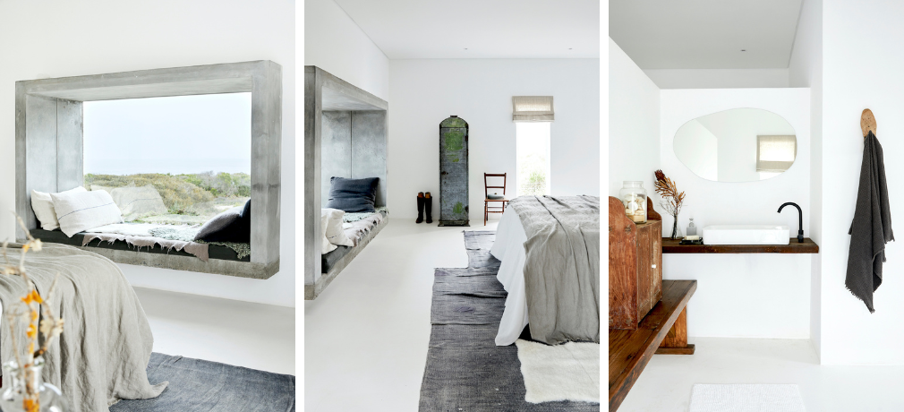 The house perfectly facilitates warm-weather pleasures when opened to the elements during the Cape’s long, hot summers. Its serene bedrooms each feature a wide window seat piled with cushions that frames beautiful views of the surrounding landscape. Elements such as these, as well as the home’s perfectly planned living space, flanked by an interior, wood-fired oven and a large open fireplace, make it even better in the winter. With the sound of rain thrumming on the roof, the interior becomes a cozy haven, warmed by the glowing fire and the stove, and lit with flickering candles. No matter the season, this is a home in which to disconnect from the bustle of modern life and reconnect with the natural world – a sanctuary in which to unwind in complete, cocoon-like peace.