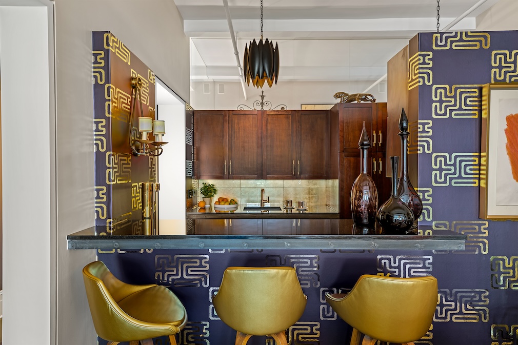 Vibrant hues and lively geometry play an especially keen role here. “I have a deep appreciation for both color and pattern, which have the power to enhance and draw attention to striking architectural elements,” declares Goralnick. “In designing our apartment, I aimed to balance the industrial feel of the loft with the warmth and intimacy of a cozy home. Each space has its own unique color story, yet they flow seamlessly together as you move from one room to the next. Pattern serves a dual purpose, highlighting the specific details of each space while unifying the overall design.”
