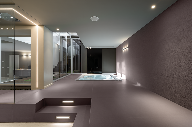 MV: As mentioned, the materials chosen for the finishes of this space were Lapitec combined and integrated with marble, wood, glass and greenery; in particular, Lapitec in the Vesuvius finish and the color “Porfido Rosso” was used for the stairs and for the flooring of the wet area (the shower area and hot tub), and in the Fossil finish in the same color for the walls of the area. Lapitec was chosen because the client had requested a natural material that had an excellent aesthetic impact, combined with long service life and easy cleaning, and where large-format slabs could be used.