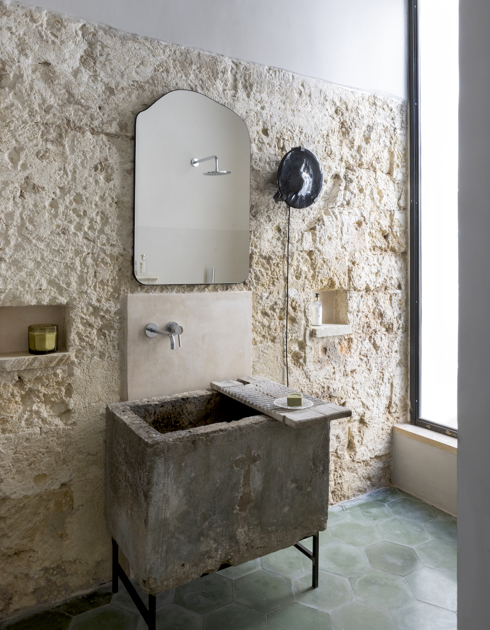 PROJECT DETAILS: CasaKorte is an historic residence dating back to the late 19th century. Recently renovated, the original structure, flooring and vaulted ceilings have been preserved, highlighting the details of the past. The residence hosts site-specific works by renowned local artists. The wall of the bathroom reveals ancient shell fossils, while the pointed arch vault creates a sacred, mystical atmosphere, a harmonious balance of art, architecture and design, allowing guests to immerse themselves in a timeless space. SOURCES: Bongio basin faucet; Marra Pavimenti green cement tiles; 18th-century stone olive oil basin; Zara Home mirror; Massimo Maci Murano fused-glass wall lamp; ancient wooden clothes washer.