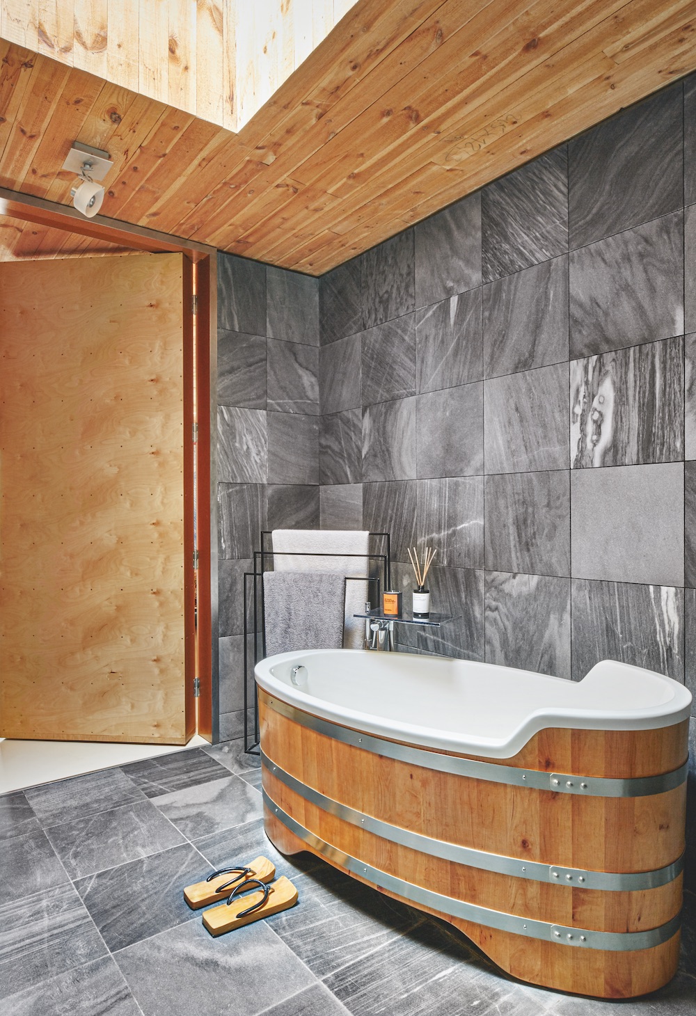 PROJECT DETAILS: This bathroom was designed as an intimate retreat, a calm, natural space with a skylight above the tub that lets in generous daylight. The raw fieldstone tiles and the wooden tub nod to rural simplicity, evoking memories of old courtyards. One can soak and look up at the sky, surrounded by textures that feel both grounding and serene. This bath palette was inspired by the natural materials themselves: stone, wood, water. These tones create a sense of calm and quiet, inviting the user to slow down and reconnect with themselves. SOURCES: Beczka Polska bathtub; Axor Massaud faucet; Beltrami natural fieldstone; raw timber ceiling boards; custom-designed doors.
