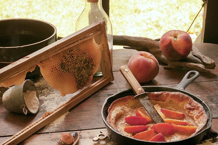 - While the pancake bakes, slice 2 peaches in half. Remove the pits and slice each half into 4 pieces lengthwise. In a small heavy pot, melt butter. When butter begins to get foamy, gently swirl occasionally until the butter turns a deep amber color. Remove from heat and cool slightly. Whisk in honey, bourbon and salt.