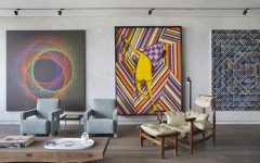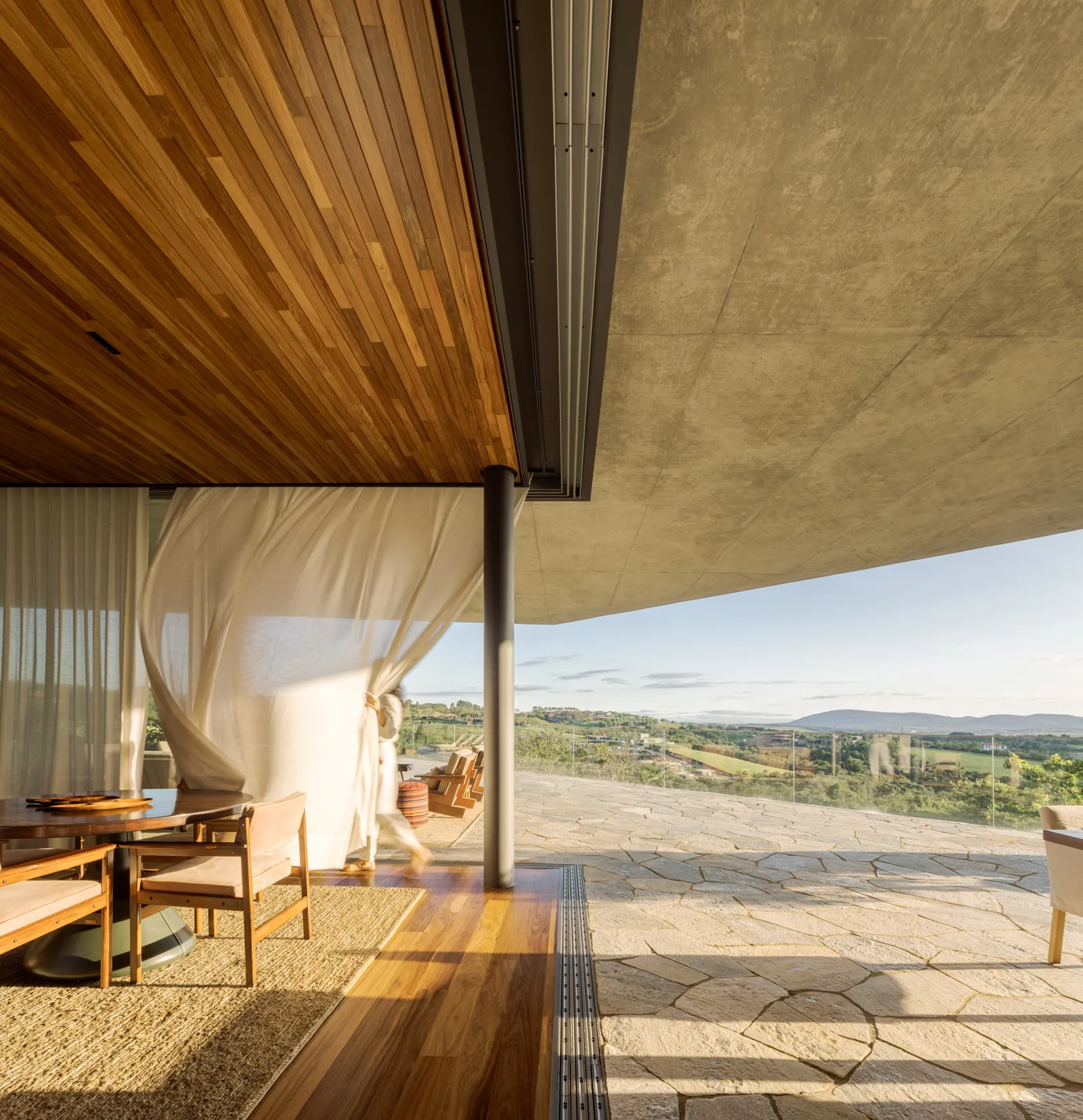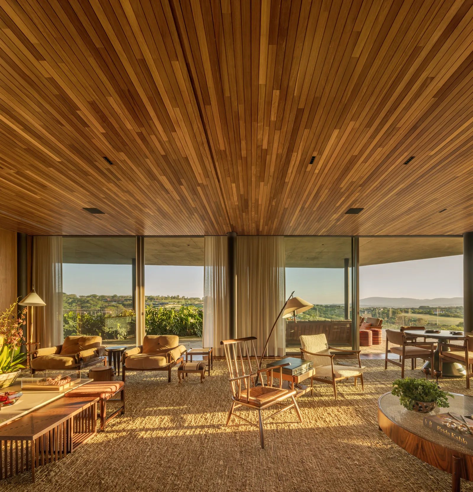 Gently contrasting with the austerity of the exposed concrete, the presence of wood for floors, ceilings and furniture, and warm colors for fabrics and carpets brings warmth, organicity, and softness. Sofas, tables, shelves, and lighting, designed especially for this project by the team at Bernardes Architecture, set the scene, alongside famous Brazilian designers such as Carlos Mota, Sérgio Rodrigues, Jean Gillon, and Joaquim Tenreiro.