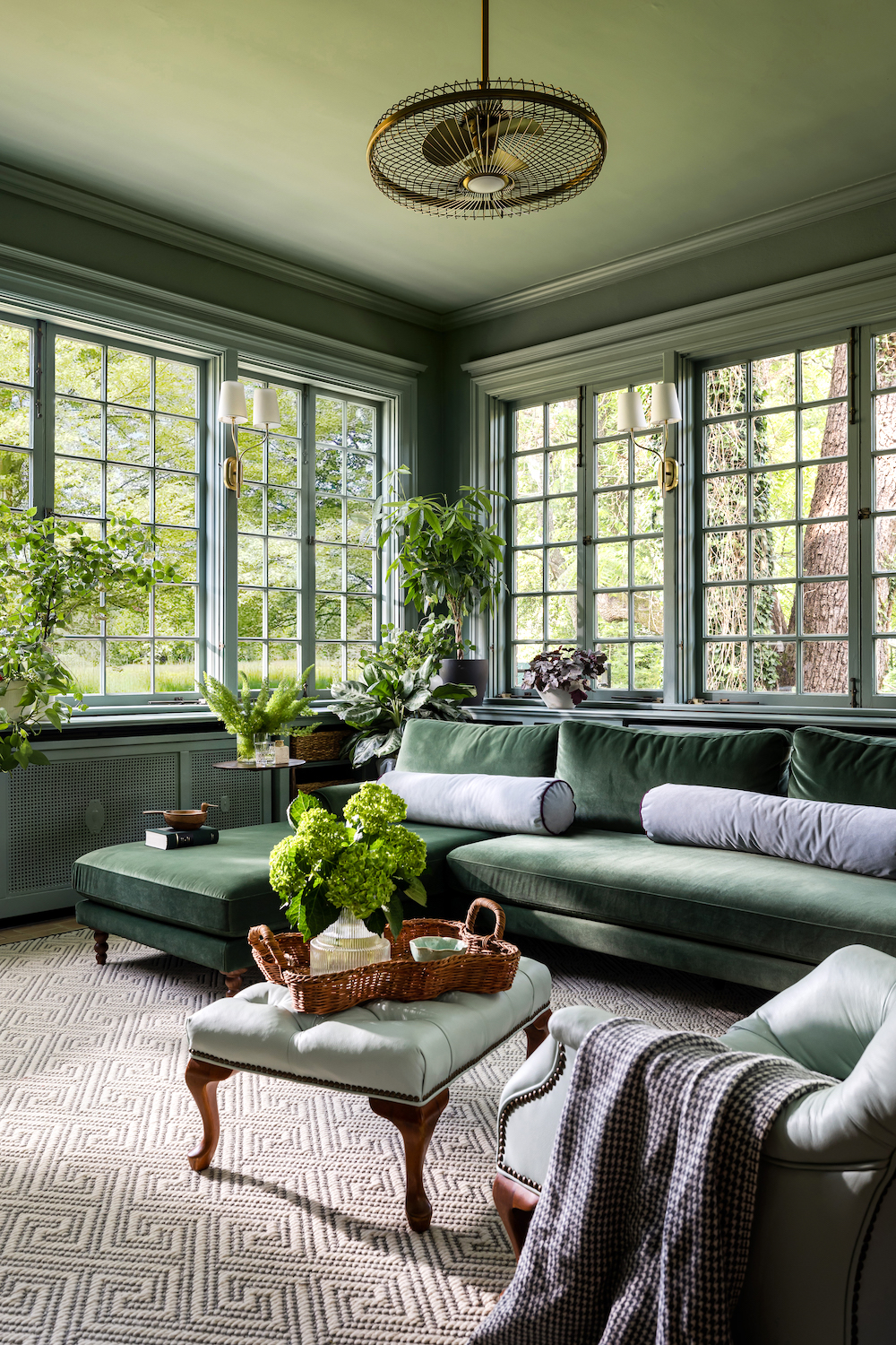 Original historic details, like conservatory windows and deep wood moldings, lend extravagance to this charming room that speaks to the surrounding nature.
