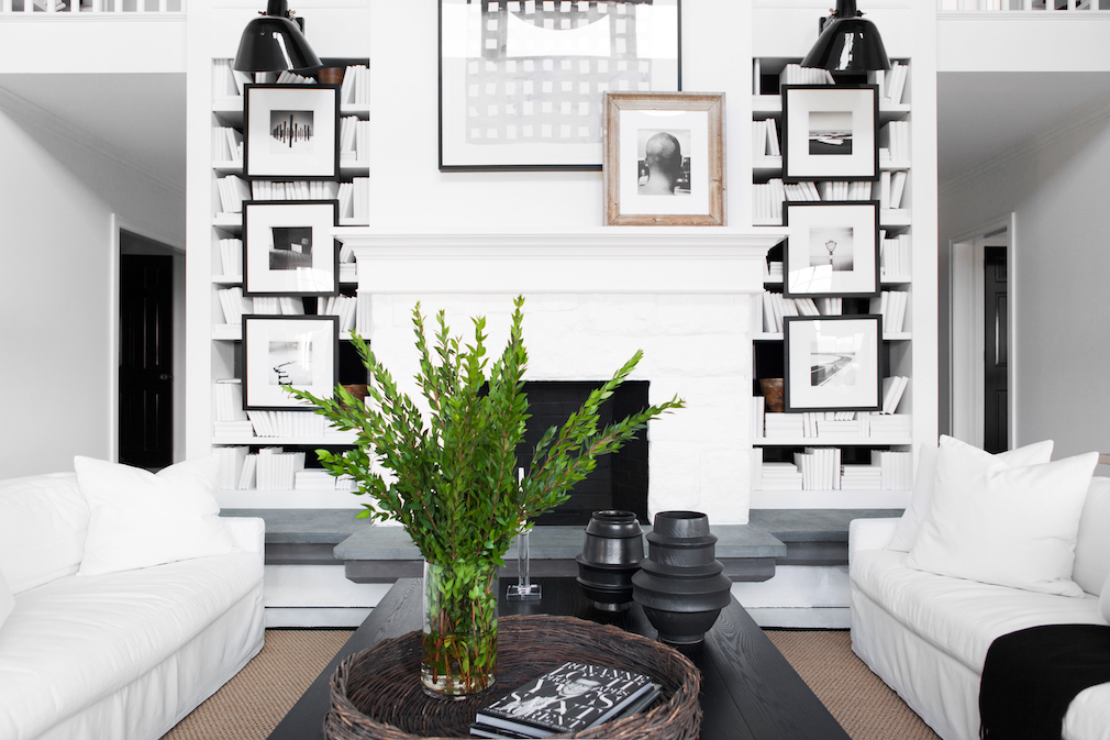 One can only imagine the thrill the owners experienced when they first entered through the home’s glossy black double doors and stood in the spacious, double-height living room. There, a white fireplace with a bluestone hearth creates a striking focal point for matching white sofas covered in a durable yet sumptuous white performance fabric.