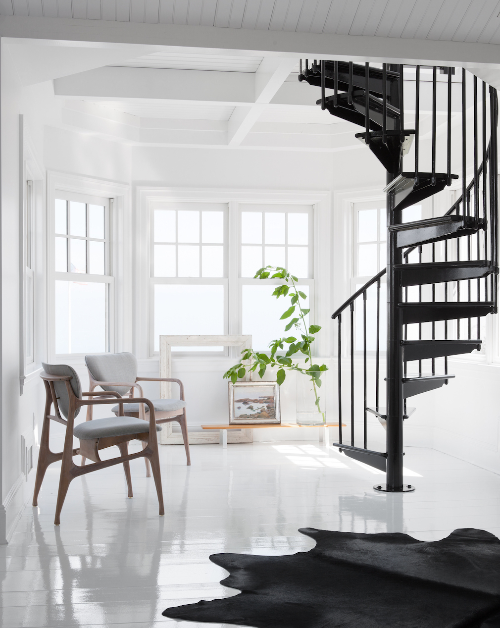During the expedited five-month project, Mazzarini and his team touched nearly every surface, painting the wood flooring in a glossy shade of white and the soaring pine ceilings in a black that resembles Shou Sugi Ban. “It was a game changer,” he shares. “A total transformation.”