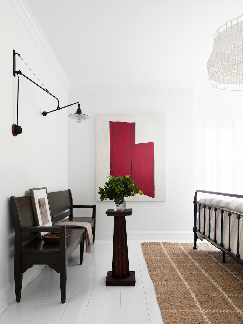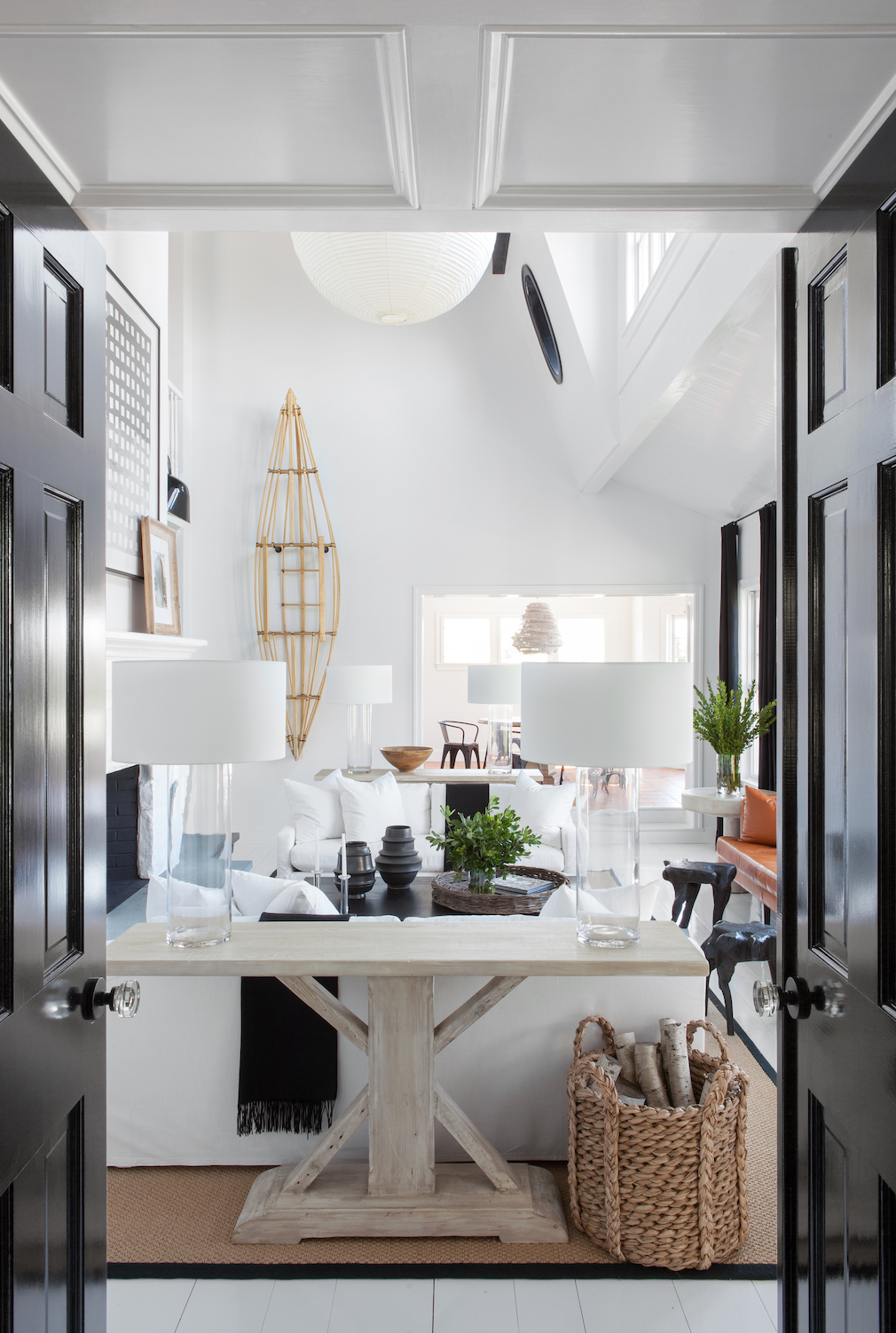 Woven baskets, natural wood elements, verdant house plants and black metal accents complete the scene. “When you’re working in a tight palette like this, a diversity of texture creates visual interest and adds warmth.” Mazzarini points to the large paper chandelier in the center of the room. “Even the whites are rendered in a variety of textures.”