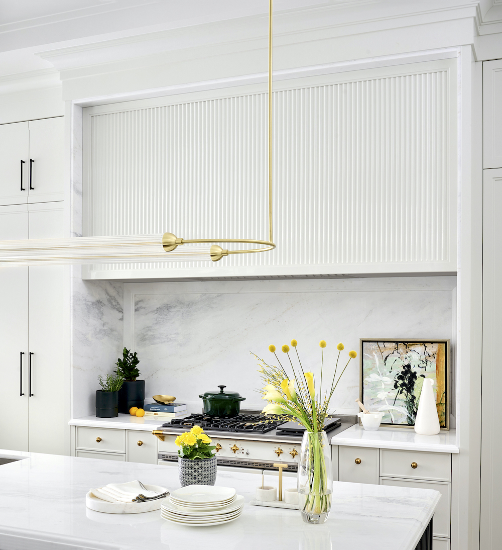 RS: I correlate many of the key features to the dressmaker’s finery. The crisp appearance of the range hood, for example, with its glossy lacquered white finish on a fluted profile reads like a plissé-fronted shirt, and the elegance of a black-on-black ensemble between matte finished islands and patent leathered stools reminds me of satin lapels on a wool dinner jacket in the classic tonal palette.