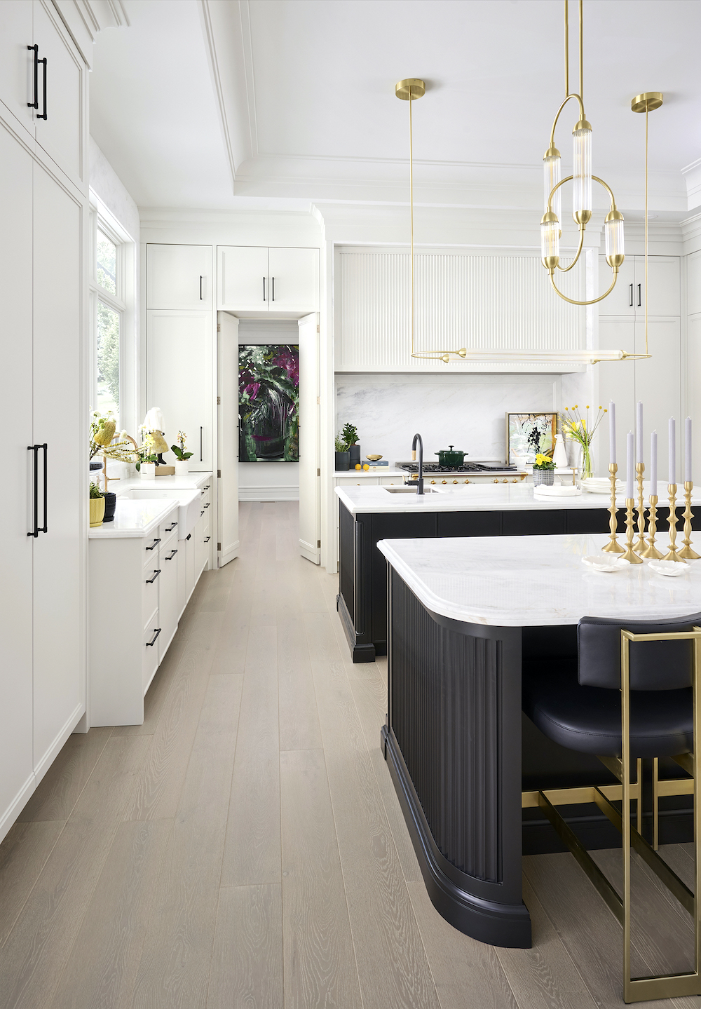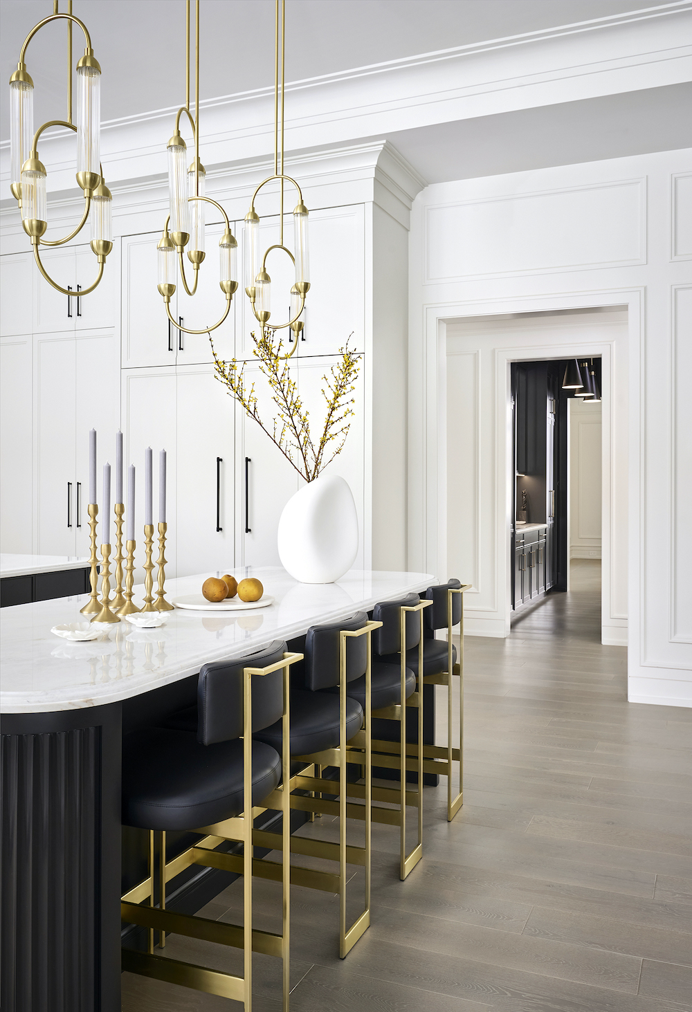 Regina Sturrock: We call it our Black-Tie Kitchen for its timeless black-and-white formality and tailored details that speak the language of couture. With their history in taste-making, our clients wanted a high-performance, showpiece kitchen for entertainment and one that would merge with the grandness of the home’s architecture. Fashion is often an inspiration in my work. I can be consumed by the minutia in fastenings or simply taken by the animated folds in beautiful cloth. The development stages of this project saw mood boards filled with images of old Hollywood gala wear and sophisticated fashion photography that seemed to breathe a suave, enduring style into our architectural features. The vibe was completely intuitive, and the Black-Tie vision was born.