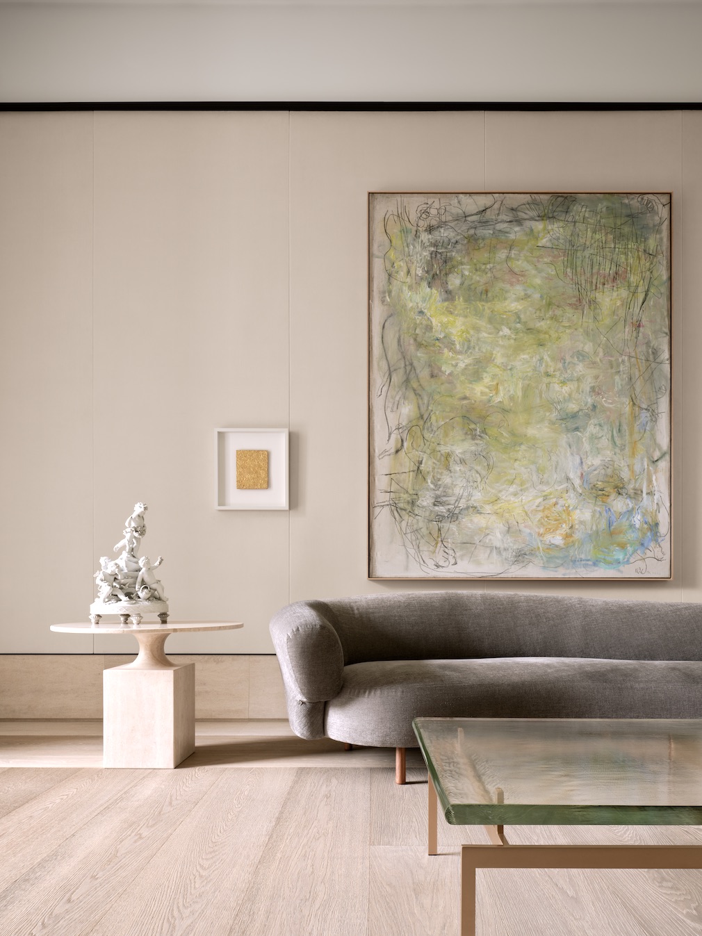 For furniture, describes Burdi, “We looked globally.” He created a mix of seating from Liaigre Studio, Bruno Moinard and Christophe Delcourt, sculptural tables by Parisian designer Eric Schmitt, and lighting by Matthew McCormick, Schmitt and Alberto Pinto. The owners’ fine antiques – a French gilded mirror, a bisque porcelain statuette of cherubs, an Aubusson tapestry – add notes of historical elegance in various spaces.