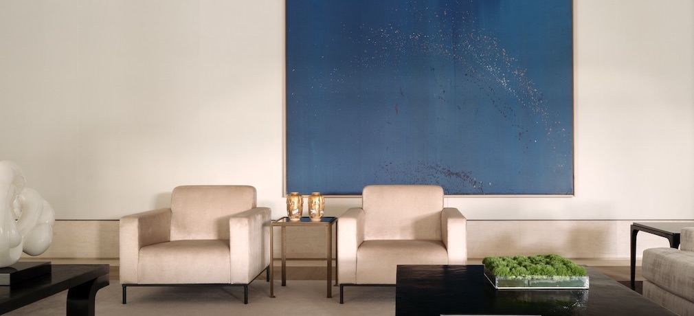 For furniture, describes Burdi, “We looked globally.” He created a mix of seating from Liaigre Studio, Bruno Moinard and Christophe Delcourt, sculptural tables by Parisian designer Eric Schmitt, and lighting by Matthew McCormick, Schmitt and Alberto Pinto. The owners’ fine antiques – a French gilded mirror, a bisque porcelain statuette of cherubs, an Aubusson tapestry – add notes of historical elegance in various spaces.