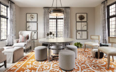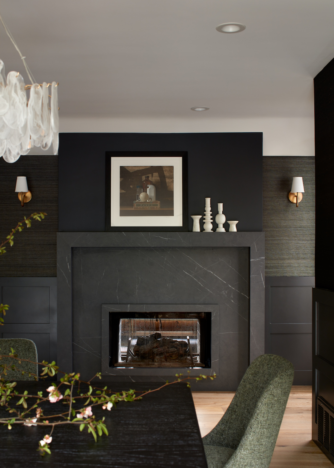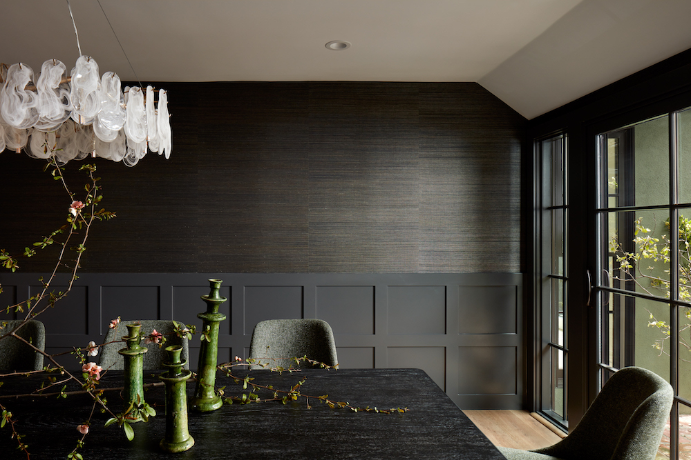 “A dark color palette was the basis for an intimate, cozy dining room with high style. What’s most appealing to me is the luxuriousness we achieved from the wall treatments. The modern paneling of the wainscotting with the slight sheen of the natural grasscloth wallpaper added subtle texture, softness and depth to the glamor of the room.”