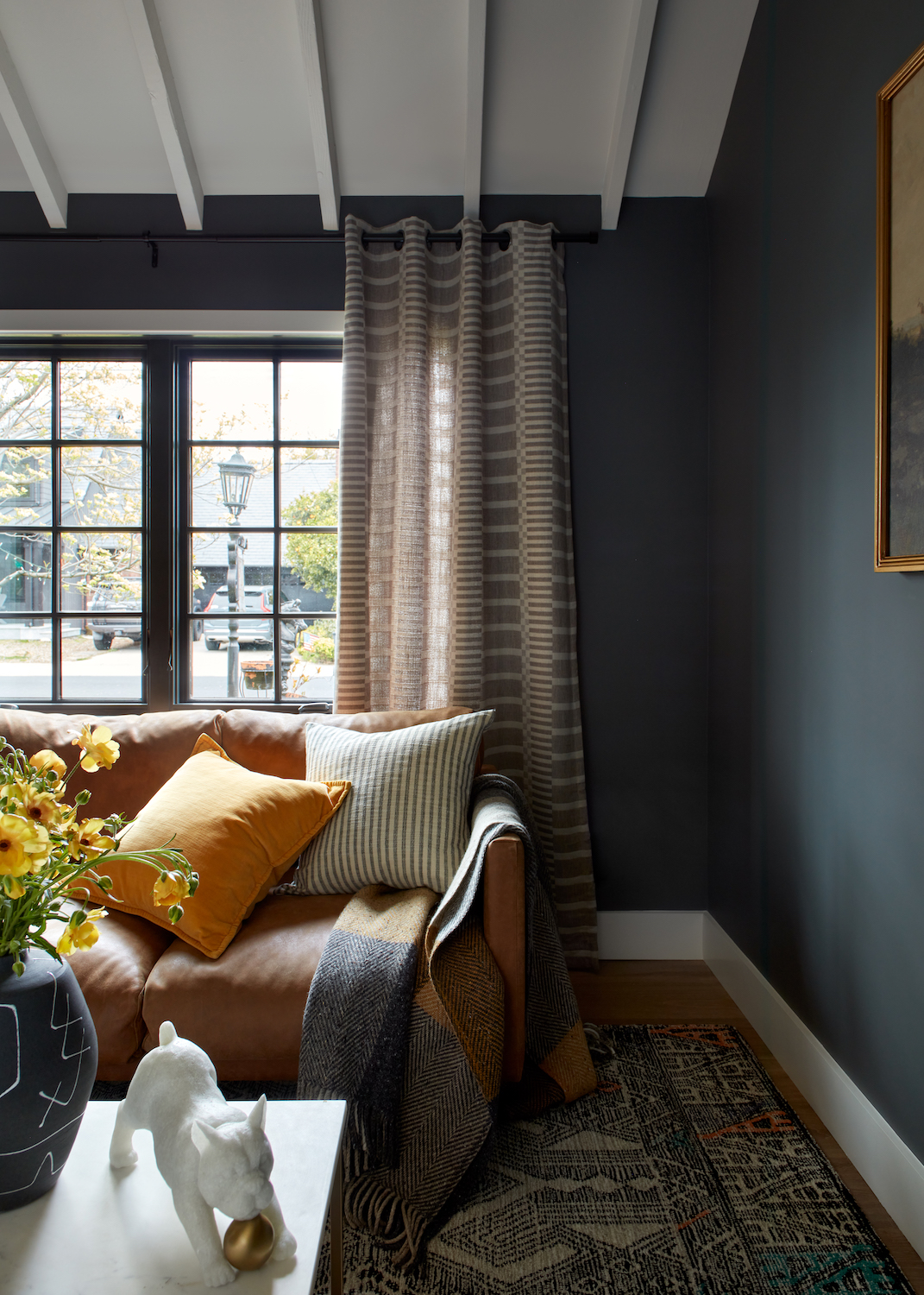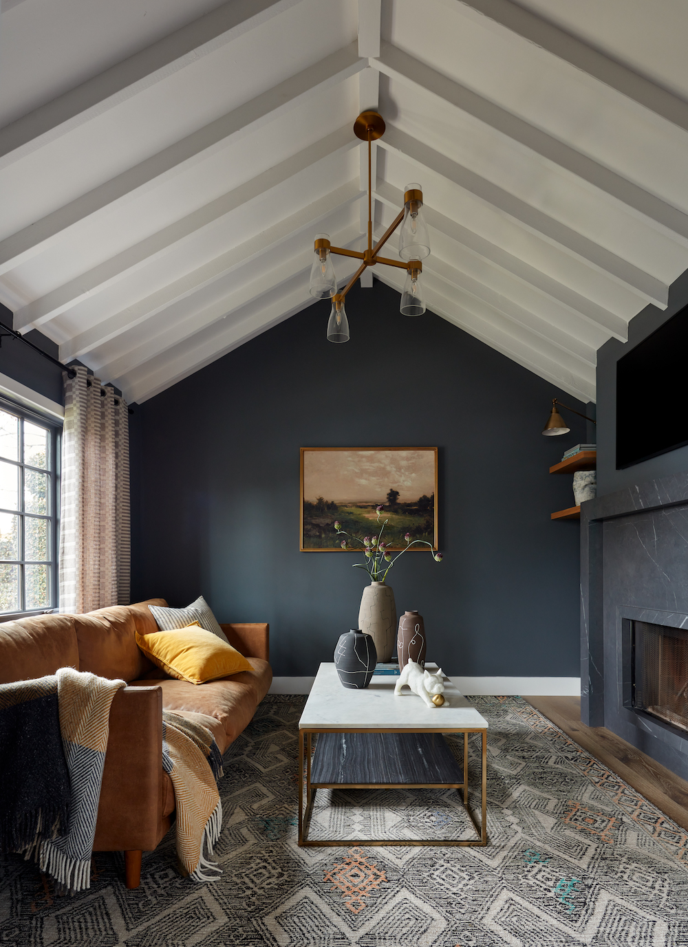 “Continuing with the dark moody feel similar to the dining room helped the den blend into the background, especially since it can be viewed from the see-through fireplace. The dining room has a deep green-blue undertone, while the den has a deep blue undertone, and the kitchen has a deep green undertone. All three rooms were tied together with the use of yellow, from the use of brass hardware and white oak cabinets to the camel tone of the leather sofa and a hint of yellow in the painting.”
