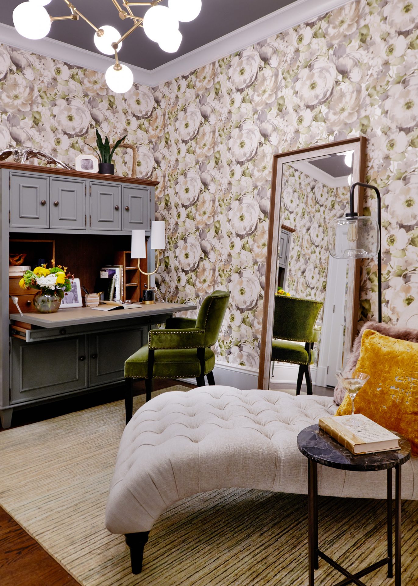 “The den was designed to be a soothing getaway space. Away from the large, bright open spaces of the kitchen and dining area this room is perfect for sneaking away to read a book or relax. The floral pattern wallcovering in bright greens and neutrals brings the soothing qualities of nature in while the dark ceiling adds warmth and coziness to the room.”