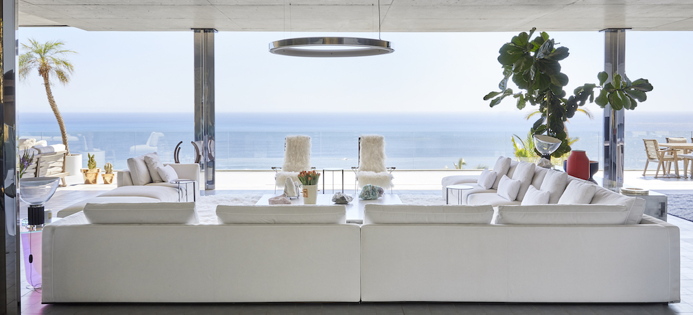 In the living area, sleek Antonio Citterio sofas provide comfortable seating but don’t visually interrupt the vista to the horizon. The natural interior finishes, which range from sandstone and marble to wood paneling, add a feeling of ease and luxury to the space. Artworks, including an ornate bust by South African contemporary art star Athi-Patra Ruga, are bound to be perennial conversation starters.