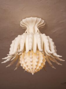Offerings include tiles and light fixtures inspired by web-like mycelium, highlighting the symbiotic relationship between fungi and tree roots; 3D-printed light fixtures which explore the delicate organic structures of diatoms, which are microscopic ocean-bourne photosynthesizers; hand-crafted furniture from reclaimed and locally harvested lumber that reveals the unique beauty of each tree; and carved wood panels that show the evolution of various plant traits, from chloroplasts on a subcellular level to the complex vascular tissue of trees. Much of this can be seen in Pallrand’s extraordinary case study called Casa Zero.