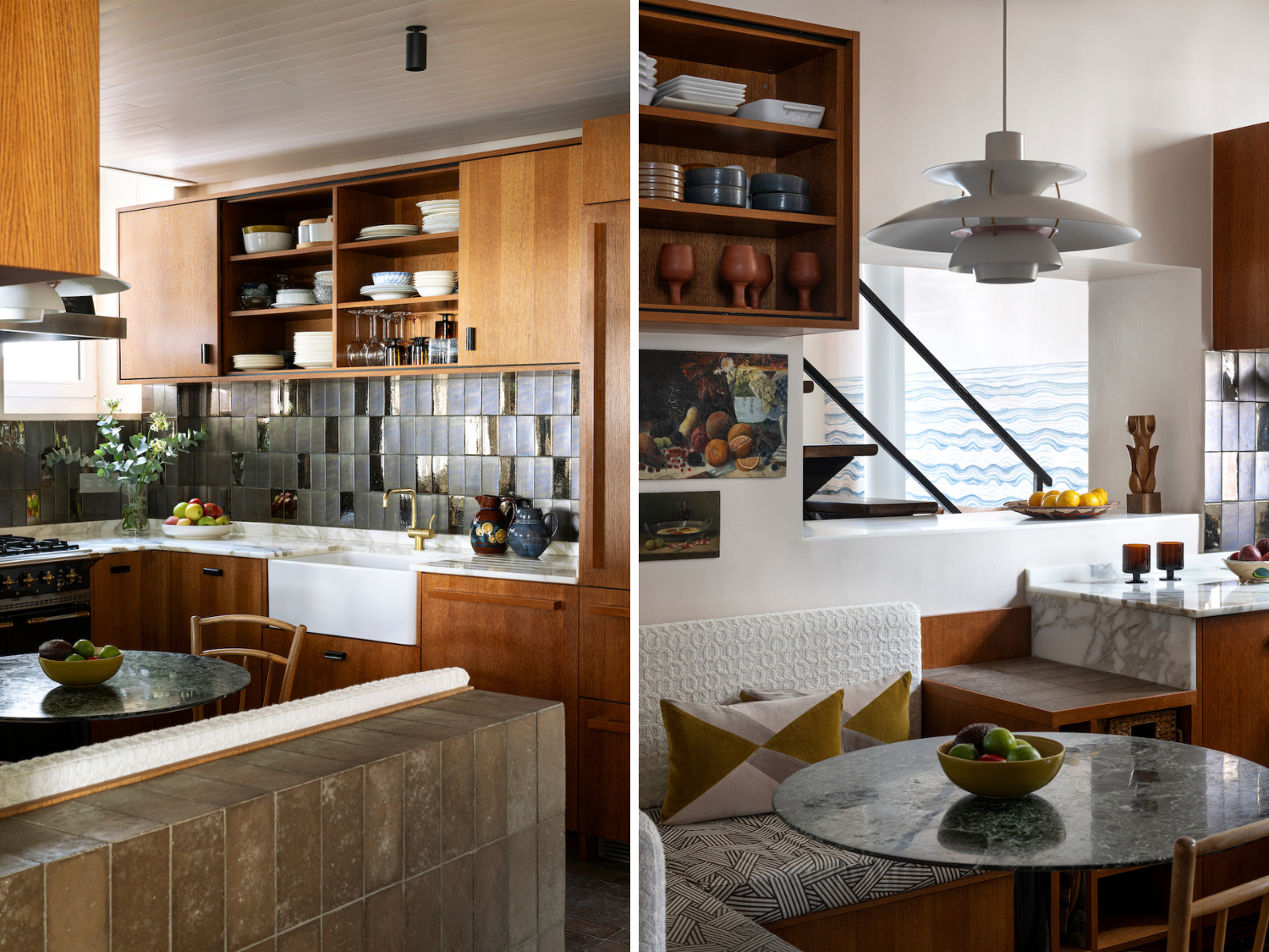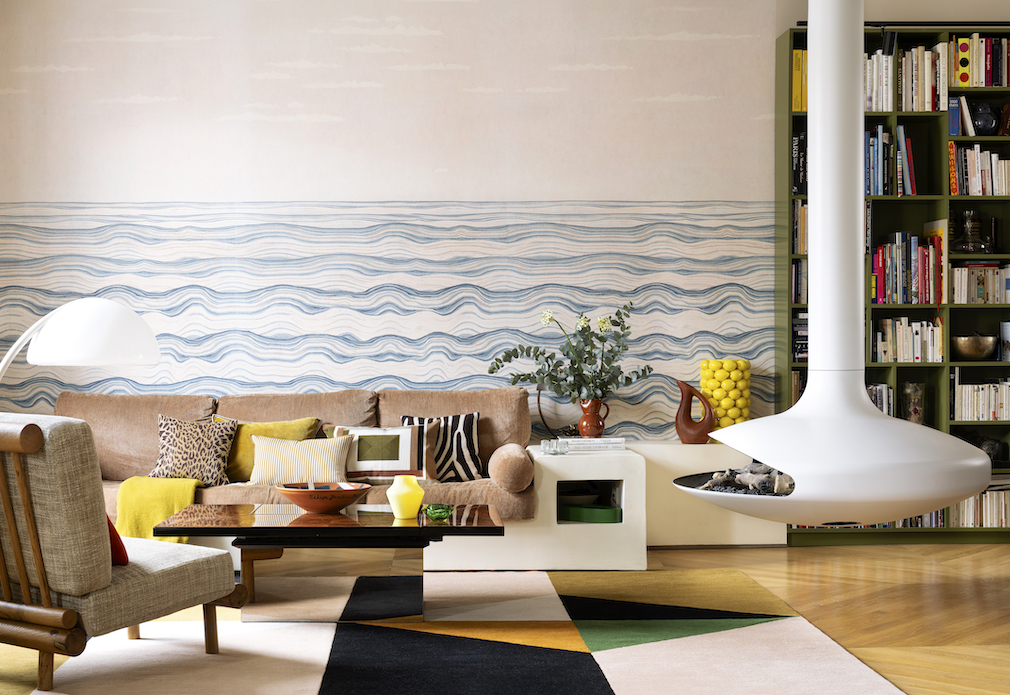 Despite being so close to the ocean, the residence does not enjoy a water view, so Dugelay made up for this by installing The Sea, a hypnotic wallpaper from Jennifer Shorto, in the living room. Gathered around a prismatic rug by Gabrielle Soyer (aka LINDELL & Co), every piece of furniture in this space has a very pronounced profile, including a slipper chair attributed to Charlotte Perriand (reupholstered in Dedar fabric), a Paul Michel mirror and burr elm table from the 1970s and the Dugelay-designed sofa with its polished concrete frame.