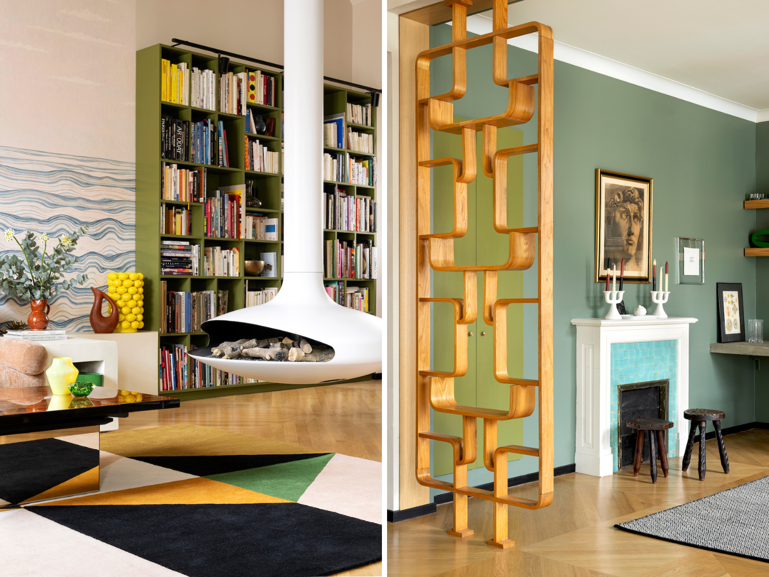 The unit had not been touched in 15 years, and Dugelay wasted no time putting her mark on it. Although satisfied with the layout of the apartment, she wasn’t pleased with the bulky block of a fireplace in the living room. Eager to open the space visually, she removed the offending feature and installed a white Gyrofocus, a classic 1960s design comprising a cylindrical flue and a disc-like hearth that hovers over the floor. For the kitchen, she imagined a singular ambiance that suggested Japan and the 1970s and brought in aged terra-cotta for the floor and cabinets she designed herself, covered in stained oak veneer and made by a Basque Country craftsman.
