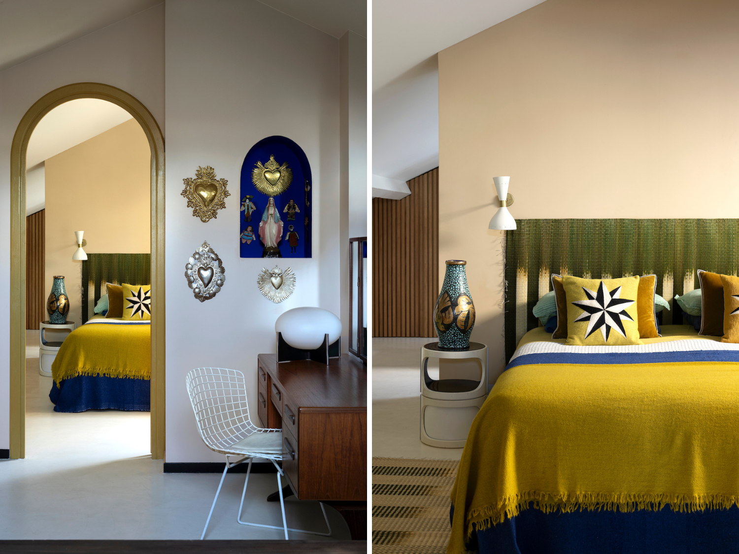 Green (“serene, but also energizing”) is Dugelay’s favorite color for decorating, but yellow and blue aren’t far behind in her home. The arched door of the primary bedroom is done in an almost cumin shade, and a painting of a woman in an interior – rendered in a deep, moody blue – is one of several flea market finds that kit out the guest room. Antiques and secondhand pieces are woven throughout the home. A number of items, including a Florence Knoll table in black wood with a star-shaped base and a set of six Afra & Tobia Scarpa chairs in wood and leather, were purchased at Saint Ouen in Paris. At the top of the stairs, a lamp Dugelay found recently at the Quinconces flea market in Bordeaux sits atop a Scandinavian dressing table scored on eBay 20 years ago.