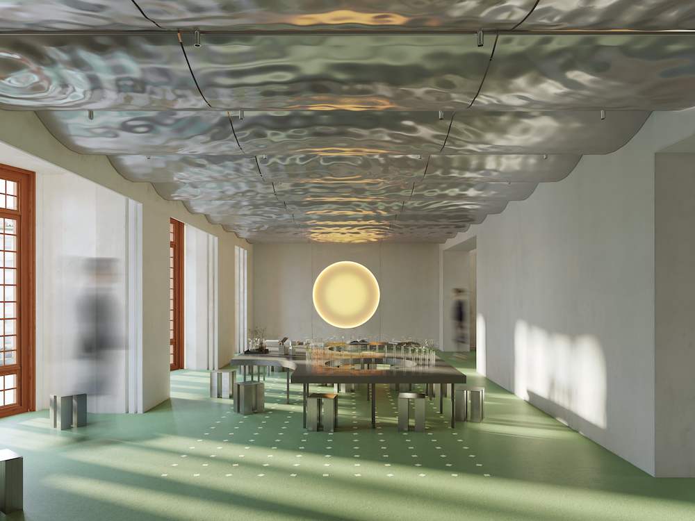 The space’s newest intervention is a curved metal ceiling, screen-printed with concentric ripples evoking a drop of water on a calm lake. Produced using robotic technology, it bestows the space with a distinct identity while fulfilling structural requirements.