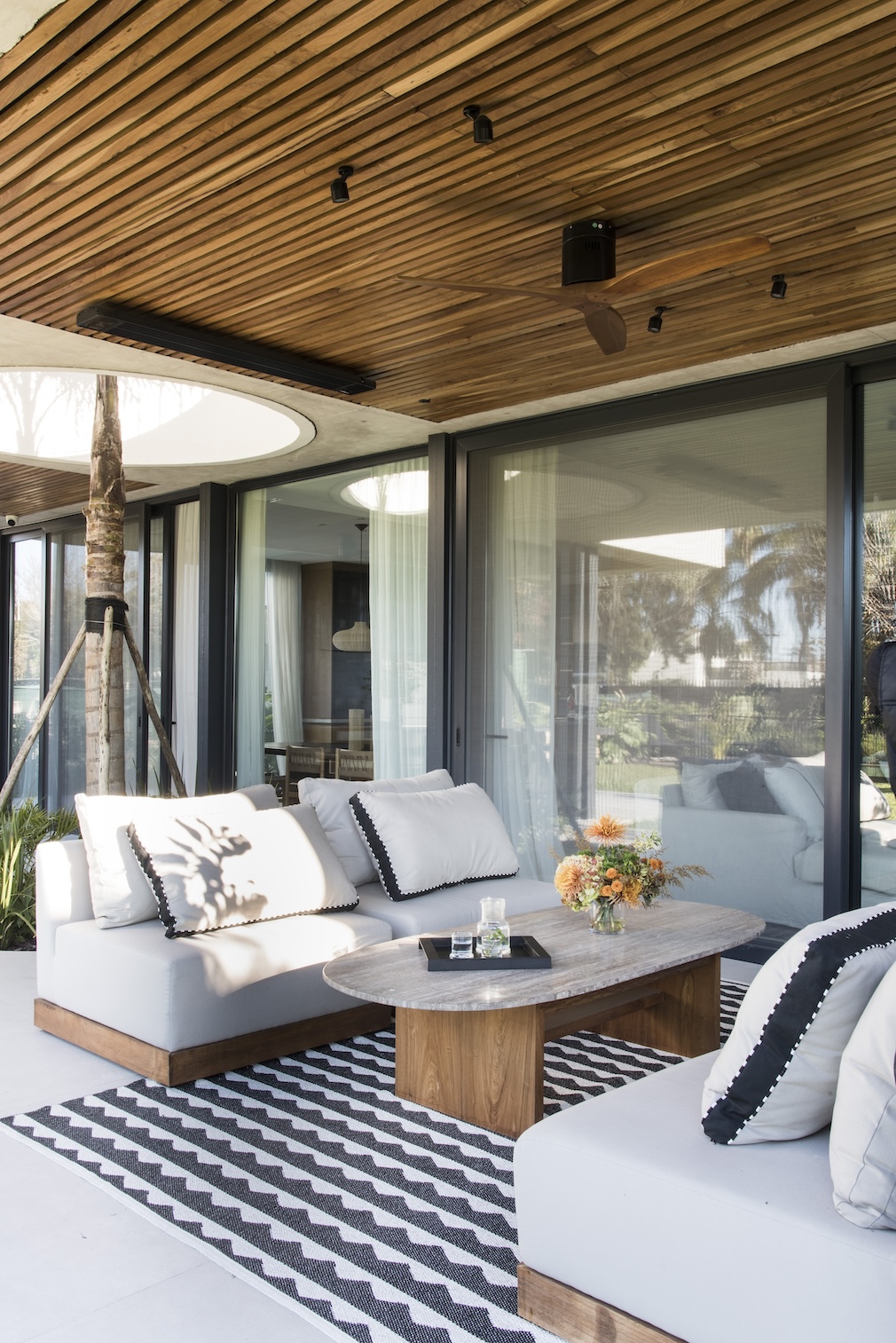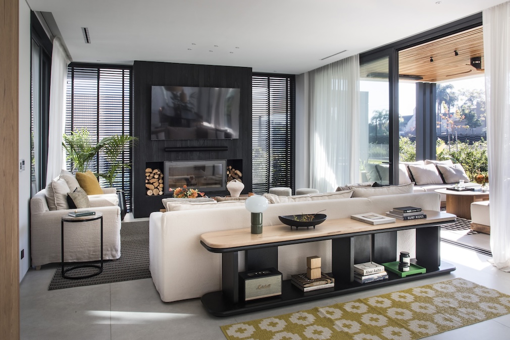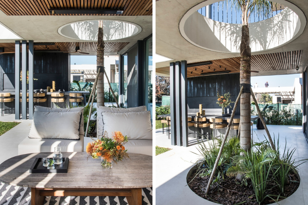 The gallery continues the project’s code: a circular void embraces the tree, making legible the interplay between the ceiling’s linear rhythm and the furniture’s curved geometry. The semi-covered outdoor bar replicates interior materials and proportions — charred wood with a semi-matte finish and a leather-finished Brazilian black granite countertop — preserving the overall grammar. The “humid” patina of the outdoor pieces responds to the local climate, reinforcing durability as a core value. This interior-exterior continuity supports expansive social life, with recurring furniture typologies and a subtle coastal touch that remains refined rather than thematic.