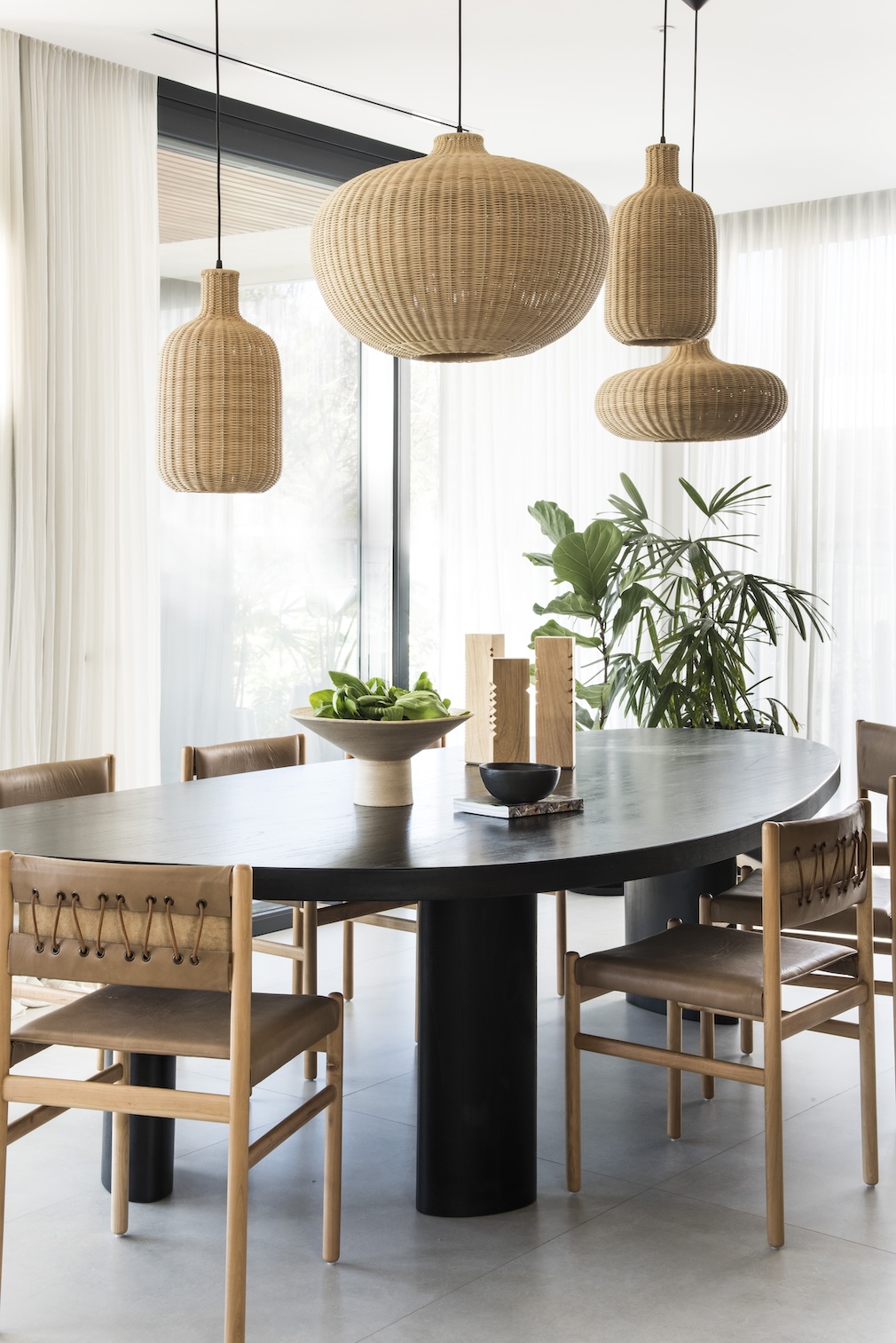 Wood sets the tactile tone of the project. Indoors, and on the gallery ceiling, white oak ensures visual and sensory continuity; where density and control are required — such as in the Derto console behind the sofa or the Breta dining table — charred wood conceals the integrated television above the fireplace, avoids adding color, and introduces depth without artifice. This family of materials is complemented by Forma rattan lamps, also designed by Melazza Mobili, suspended at varying heights to introduce an organic gesture that lightens the geometry. The coherence between materials, finishes, and functions allows the house to gain character with time.