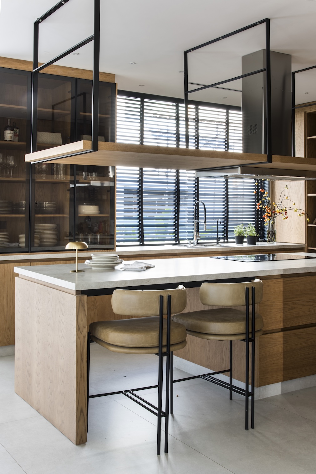 Natural light is modulated through blinds in the living and kitchen areas, fine-tuning reflections and privacy throughout the day. By dusk, the generous panes frame the garden and soften the transition between indoors and outdoors. The same language extends to the bedrooms, where material continuity, a restrained palette, and noble textiles sustain a tranquil and functional atmosphere for family life. Bathrooms follow the same logic with clean planes and a sober composition, prioritizing order and clarity over object-centered display. Every detail — from countertop height to the tactile precision of a handle — contributes to a quiet, efficient, and gentle experience, reinforcing the dialogue between architecture and interior design.