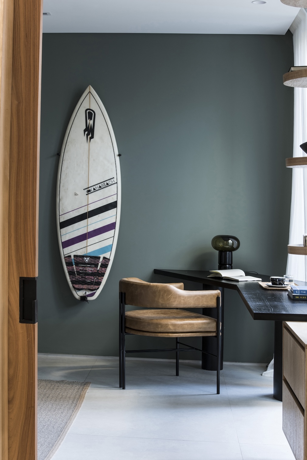 The principle of continuity extends to custom-made furniture and precise calibrations of proportions and flows. In the study, a curved wooden volume offsets the symmetry of the window, optimizes usable surface, and — thanks to its formal affinity — echoes the dining table. The piece functions as a bridge between social and work areas. The clients requested an integrated approach — few furniture types, like the Carpano stools used both indoors and out — to maintain visual calm. Curves and lines, textures and smooth surfaces balance without literal references, resonating with the owners’ interests — such as surf culture — through proportion and material rather than overt symbolism.