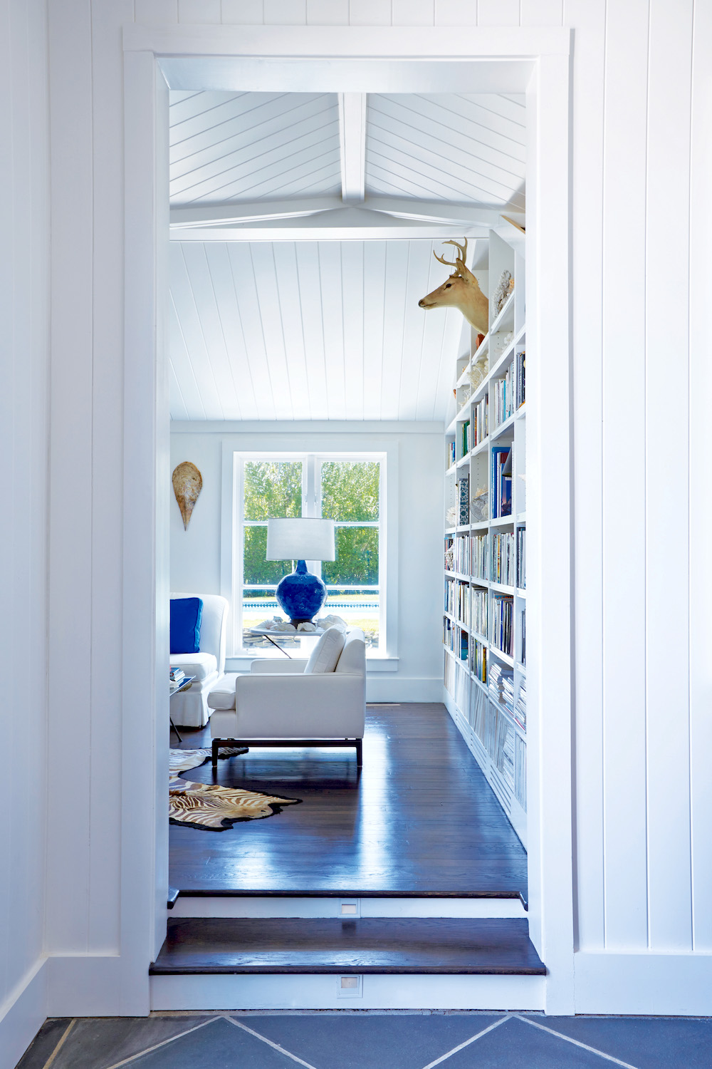 Durability is the second element. Note the simple, white slipcovers on the sofa–machine-washable to retain a crisp edge. Third is the use of a melange of furnishings, seen here with everything from the 19th-century fireplace mantle in the living room to the low-slung, midcentury chairs scattered about to the African bed-turned coffee table in the living room.