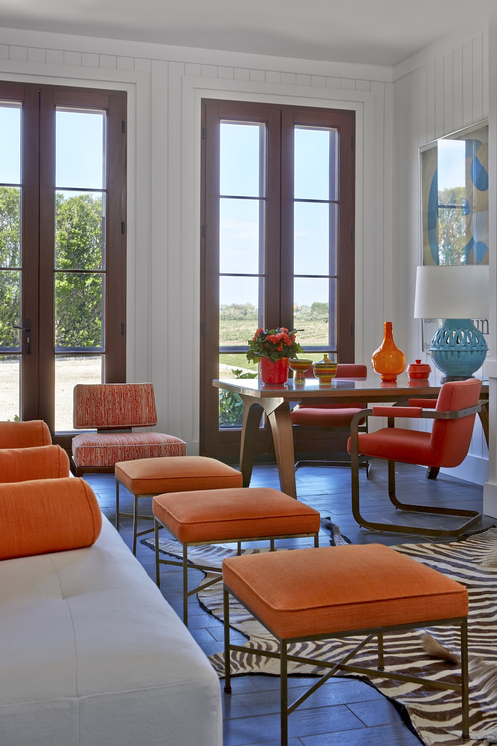 USING COLOR | Color does not come organically during Barman’s design process. It takes “conscious effort because it is challenging to coordinate.” That said, whether in upholstery, lighting, walls or furniture, as illustrated in the photos on these pages of a house he did in the Hamptons about 10 years ago, the way the color is employed appears to be effortless and natural.