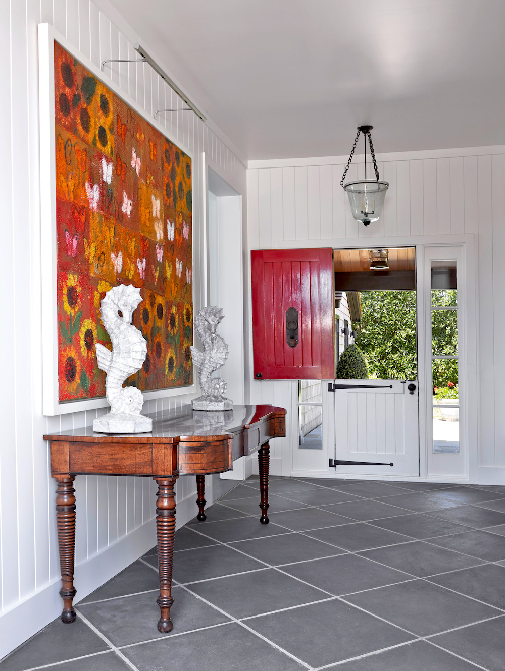 The concept for the interiors was a “Moroccan-influenced country look,” propelled by the lush, red-and-purple patterned yellow cotton upholstery seen on a number of chairs and pillows. Certain things have changed over the years, most of them small, as in the dining room, where a dark, traditional chandelier was originally selected because the owners thought something overtly Moroccan would be “too much.” A while ago, it was replaced with the bright red, patently Moroccan one hanging there now. Primarily, however, it’s the art that has changed, becoming larger in scale, brighter and more contemporary.