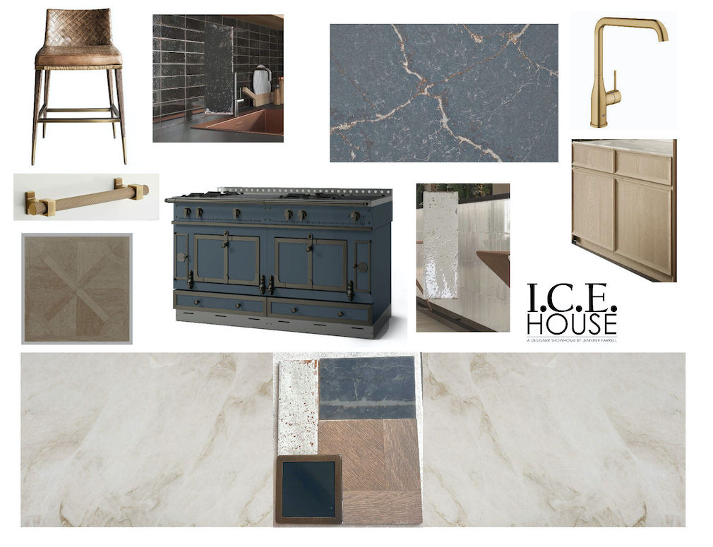 To craft the hood, I’m working with this Parisian blue Silestone from Cosentino that has a beautiful metallic veining of copper in it. This is part of why I love going to the factories and doing a deep dive on what’s available. These blues, from two different companies, are tonal matches of each other. I had to really see them to make this happen.