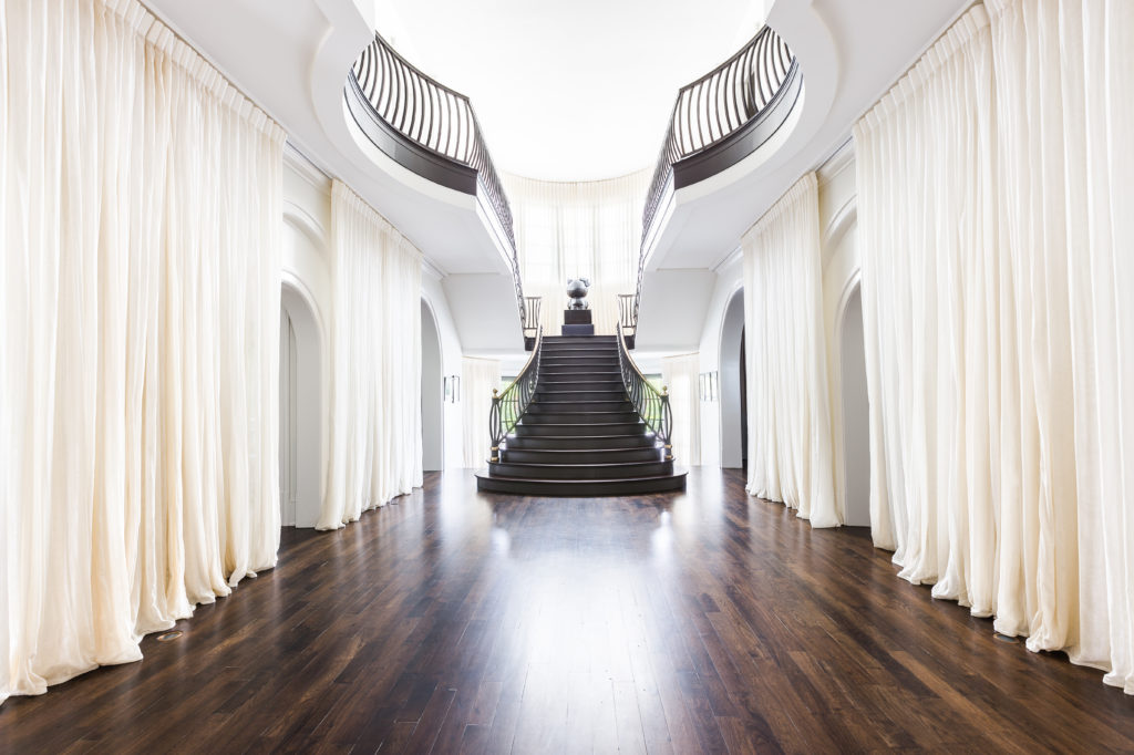 Striking in a different way from the bedroom with its en suite dressing room and bath, is the grand hallway, which rises 28 feet to the barrel ceiling and runs approximately 22 feet wide through the length of the house. Used for receptions, it’s draped on either side for guests’ arrival. Following cocktails, the drapes are pulled aside, revealing the various rooms the throng will now enter. A Tom Sachs’ “Hello Kitty” sculpture keeps tabs on the goings-on at the top of the stairs.