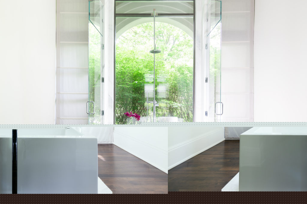 Placed as it is for a glorious view of the garden, a massive soaking tub by Dornbracht guarantees total relaxation. In between stands a glass enclosed shower.