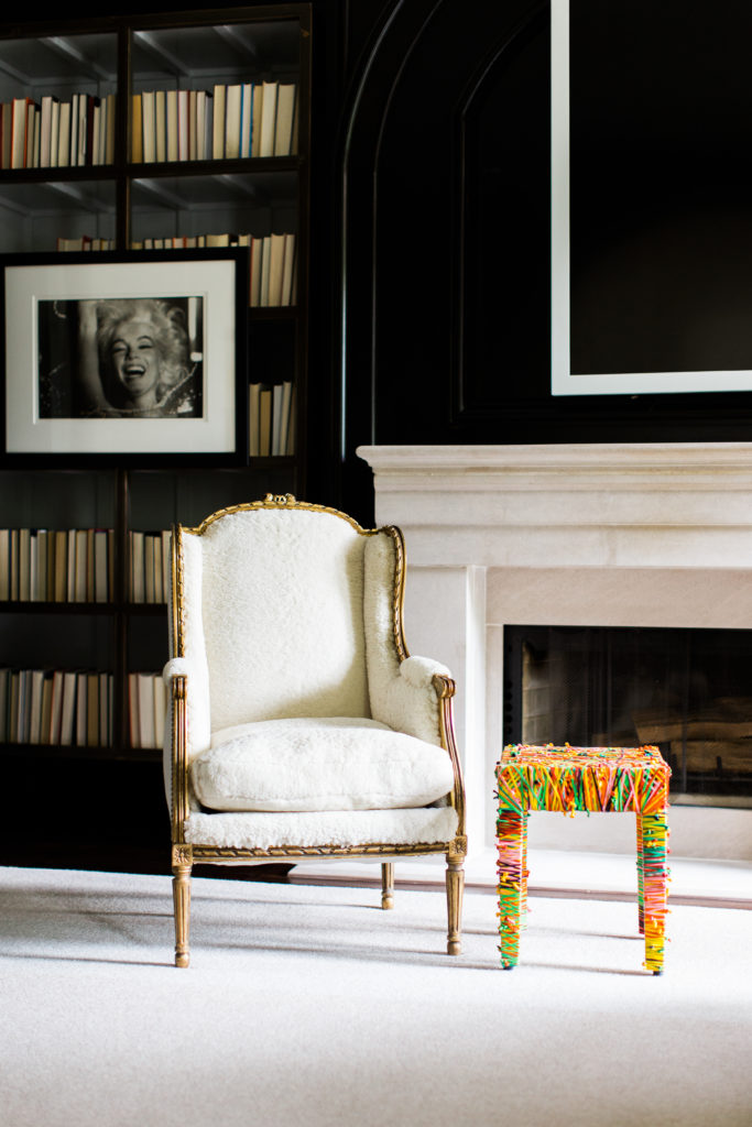 Wrapped with balloons, the occasional table found at Barneys New York contrasts with the shearling-upholstered bergere in every aspect possible. Above the fireplace is a Julian Opie video.