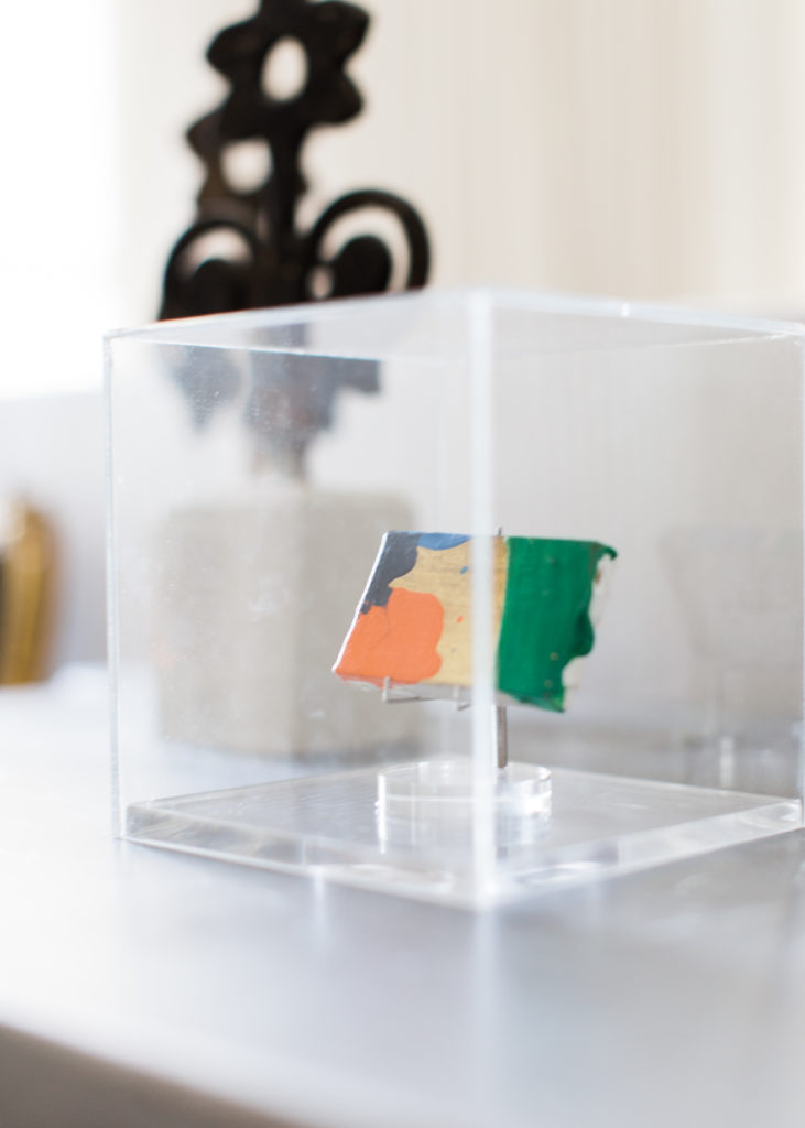 Encased in an acrylic box is a Jackson Pollock oil measuring three inches by two inches.