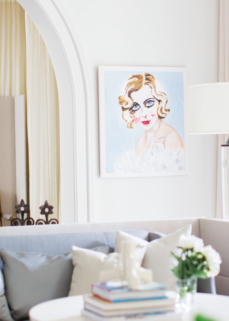 An untitled, rather quirky work of art reigns over a corner of the salon. The sofa by Dessin Fournir is upholstered in a Great Plains blue linen from Holly Hunt.