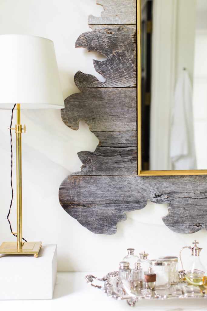 James anchored a gilt-framed mirror onto a slab of fumed wood cut in the Rococo style for the master bath – a fine example of juxtaposing curved and straight lines, as well as layering textures.