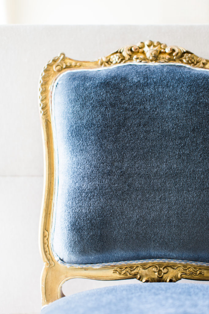 Bought at auction and rumored to have belonged to one of Marie Antoinette’s daughters, this is one of a pair of chairs. Covered with steel blue silk mohair and edged in silk cord, they are the oldest pieces in the house.